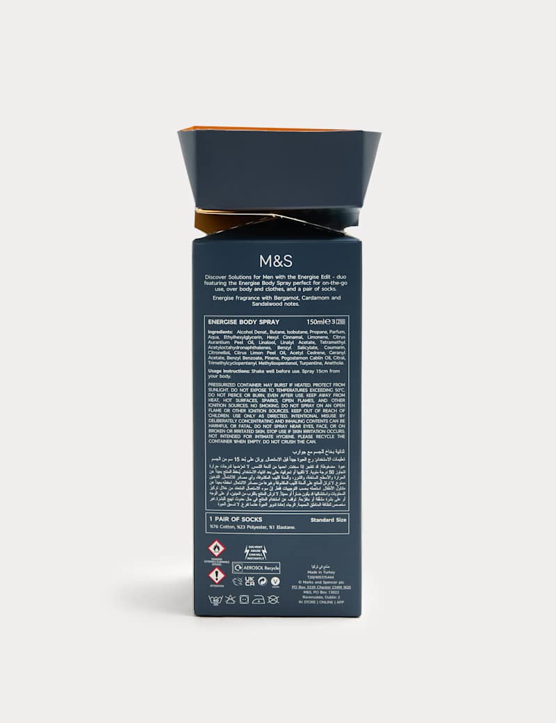 For the man who appreciates the little luxuries, this Energise duo from our Solutions for Men range is the perfect gift. The body spray blends bright bergamot and cardamom with smooth sandalwood for an invigorating, modern scent that lasts all day. Paired with classic striped ankle socks, its a simple yet stylish way to add freshness and comfort to his daily routine.