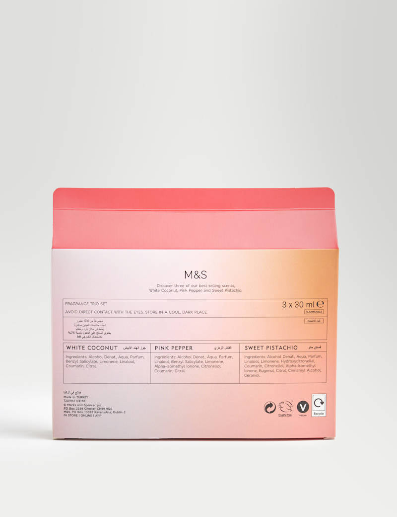 Play with scent and mix up your mood with this Discover fragrance set. It includes three 30ml eau de toilettes from the collection, each crafted to be worn alone or layered together for a personalised finish. White Coconut blends tropical sea-salted coconut with the freshness of white flowers and iced citrus, while Sweet Pistachio combines nutty notes with tuberose and tonka bean. Pink Pepper balances vibrant orange blossom and jasmine over a warm base of vanilla and amber musk.