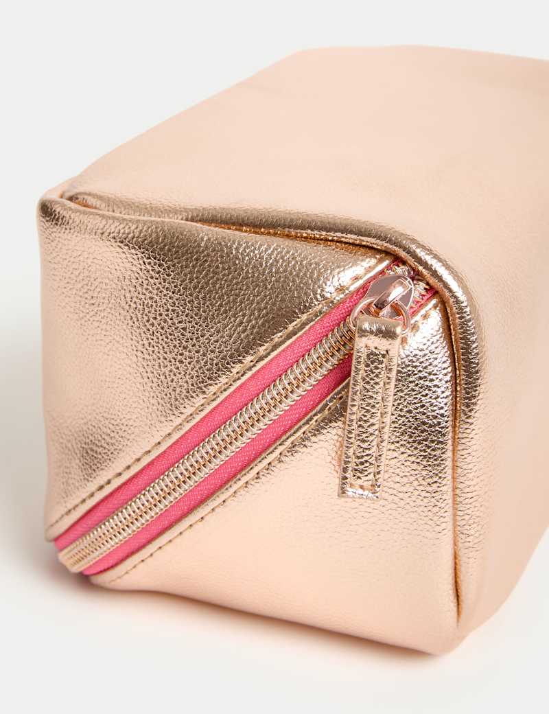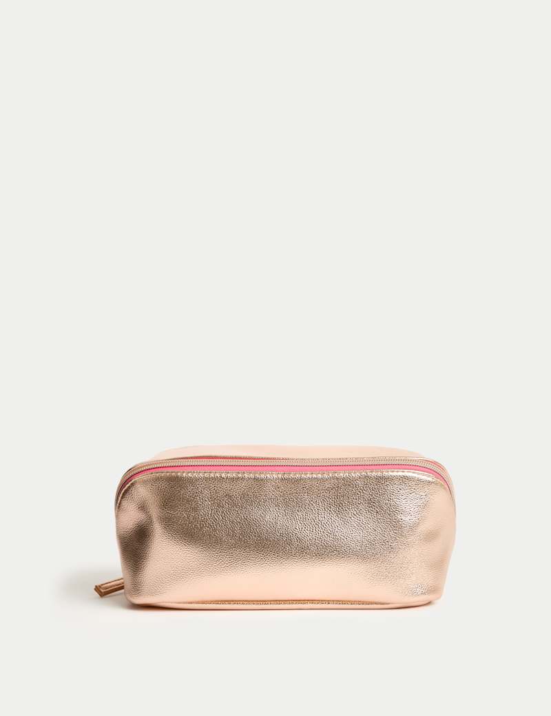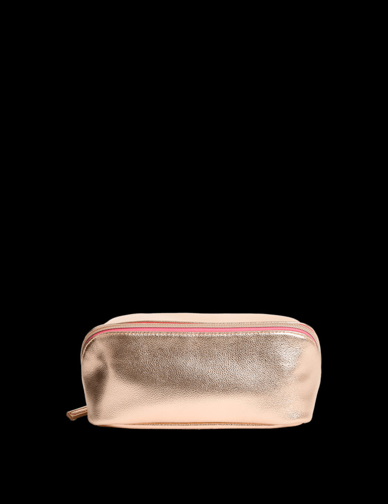 This makeup bag gives you easy access to your beauty essentials with its convenient wide-opening design. The metallic gold exterior houses a vibrant striped interior, complete with two spacious main compartments divided by a central zipped pocket. Multiple elastic pockets offer smart organisation, while a gold zip and toggle complete this luxurious travel companion.