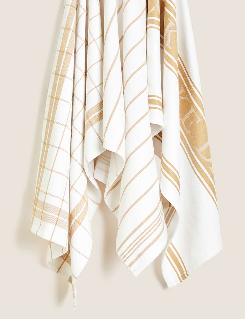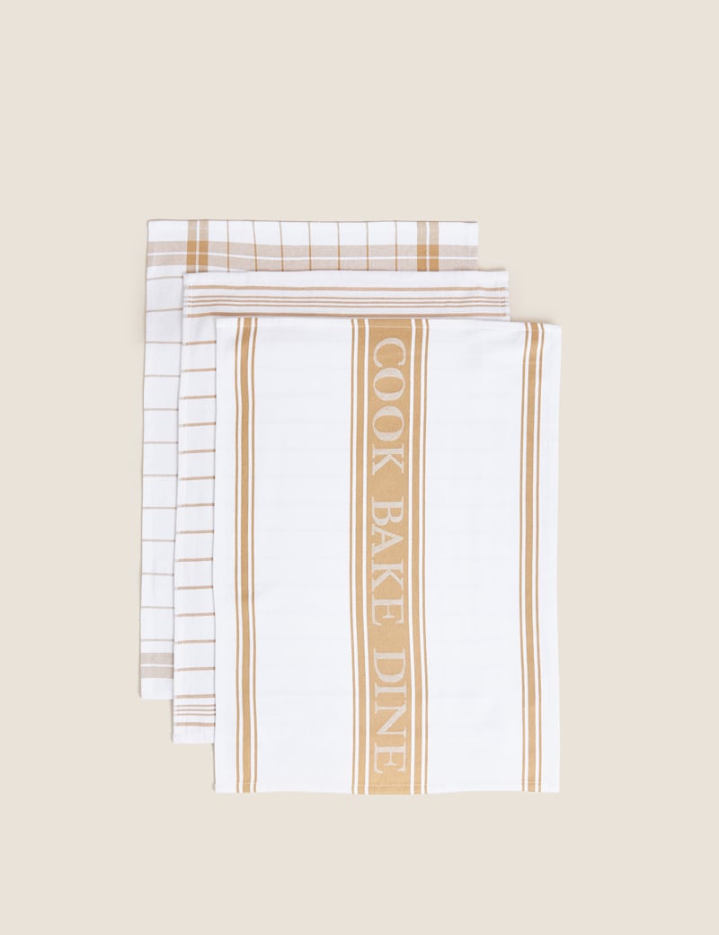 Cotton-rich fabric gives these classic tea towels a highly absorbent quality. The set comprises one striped design, one with windowpane checks and the other featuring a 'Cook, Bake, Dine' slogan. Our antibacterial finish keeps its surface fresh.