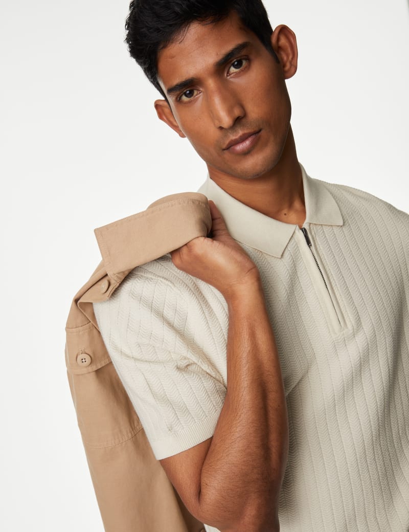 With its knitted cotton-rich fabric, this short-sleeved polo shirt feels as good as it looks. The zip-up neck makes it easy to slip on and off. A textured herringbone finish and neat collar add stylish detail.