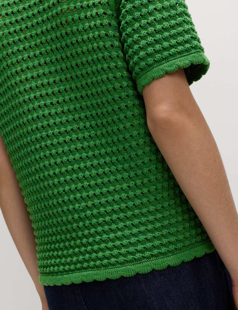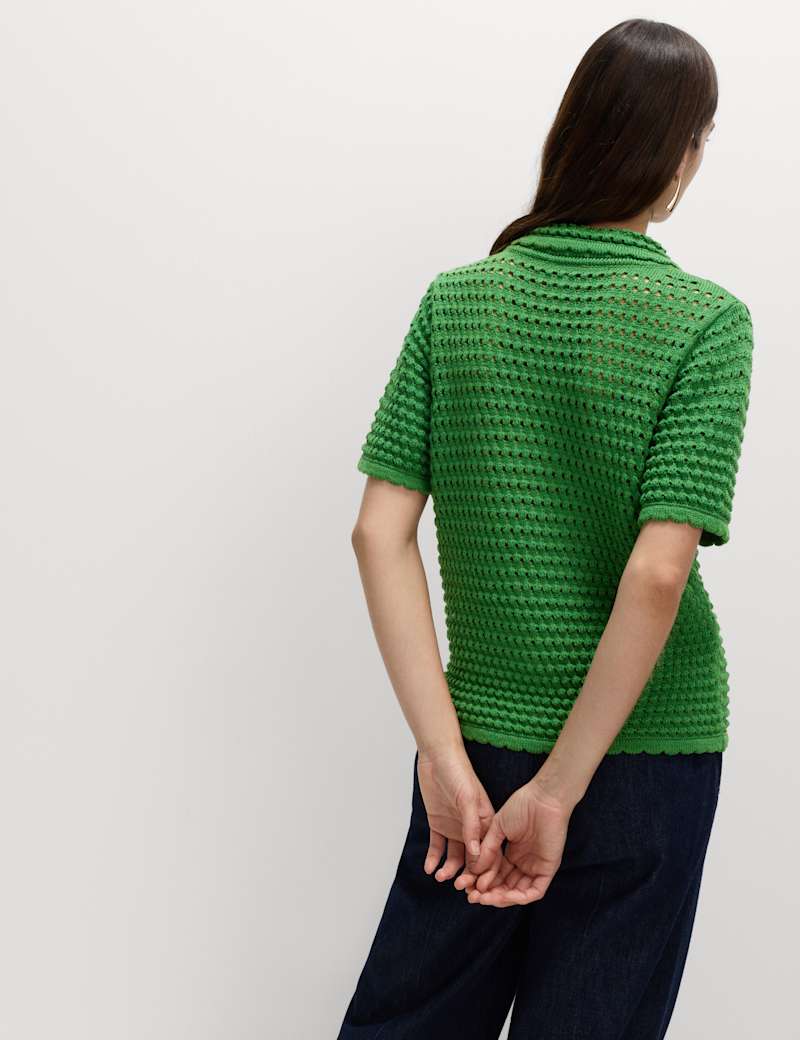 This cotton-rich knitted top offers a contemporary twist on a sporty classic. It's designed in a regular fit, with an open-stitch texture for breathability. A collared neck and button placket create a smart polo-inspired look. The design is complete with contrasting scalloped trims on the collar, short sleeves and hem for a feminine flourish.