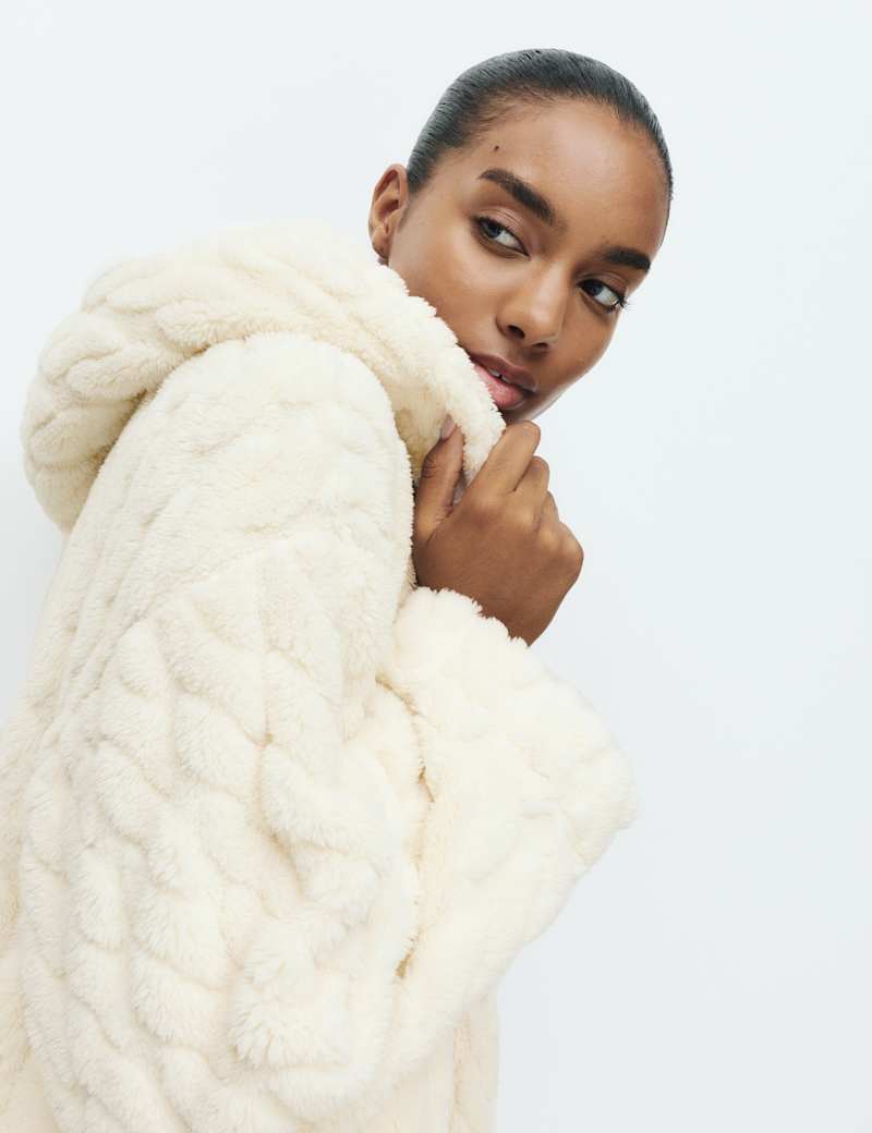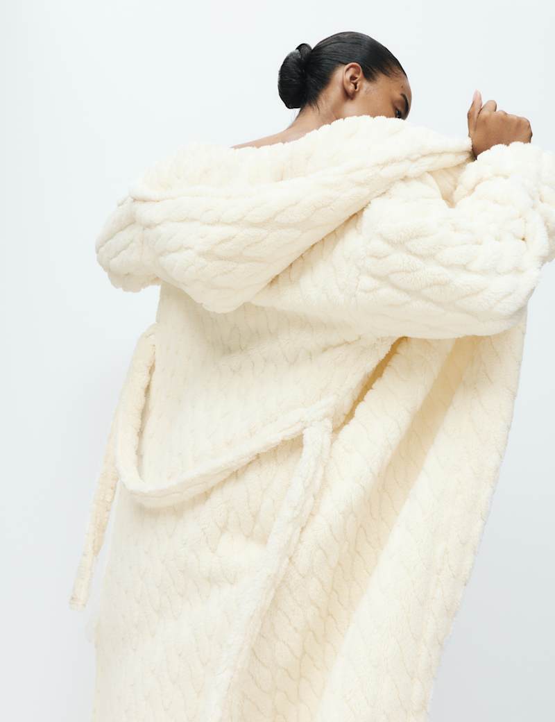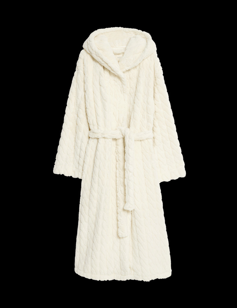 A plush jacquard texture brings plenty of cosy charm to this long dressing gown. Regular fit, complete with a belt fastening, long sleeves and a hood for extra warmth.
