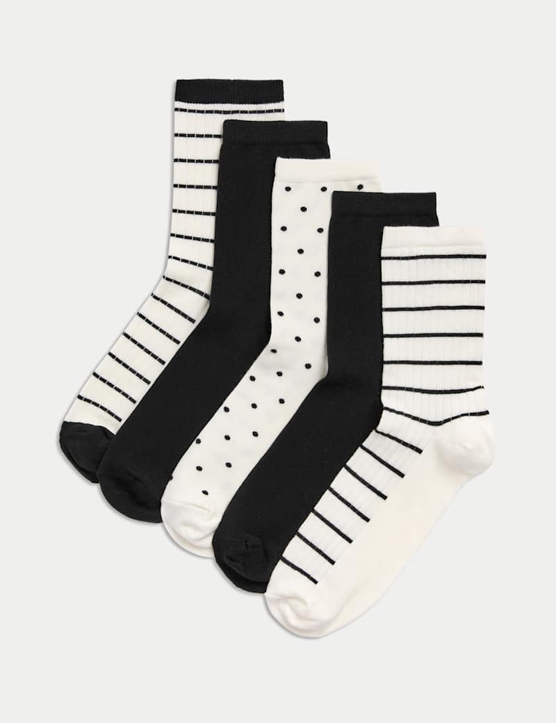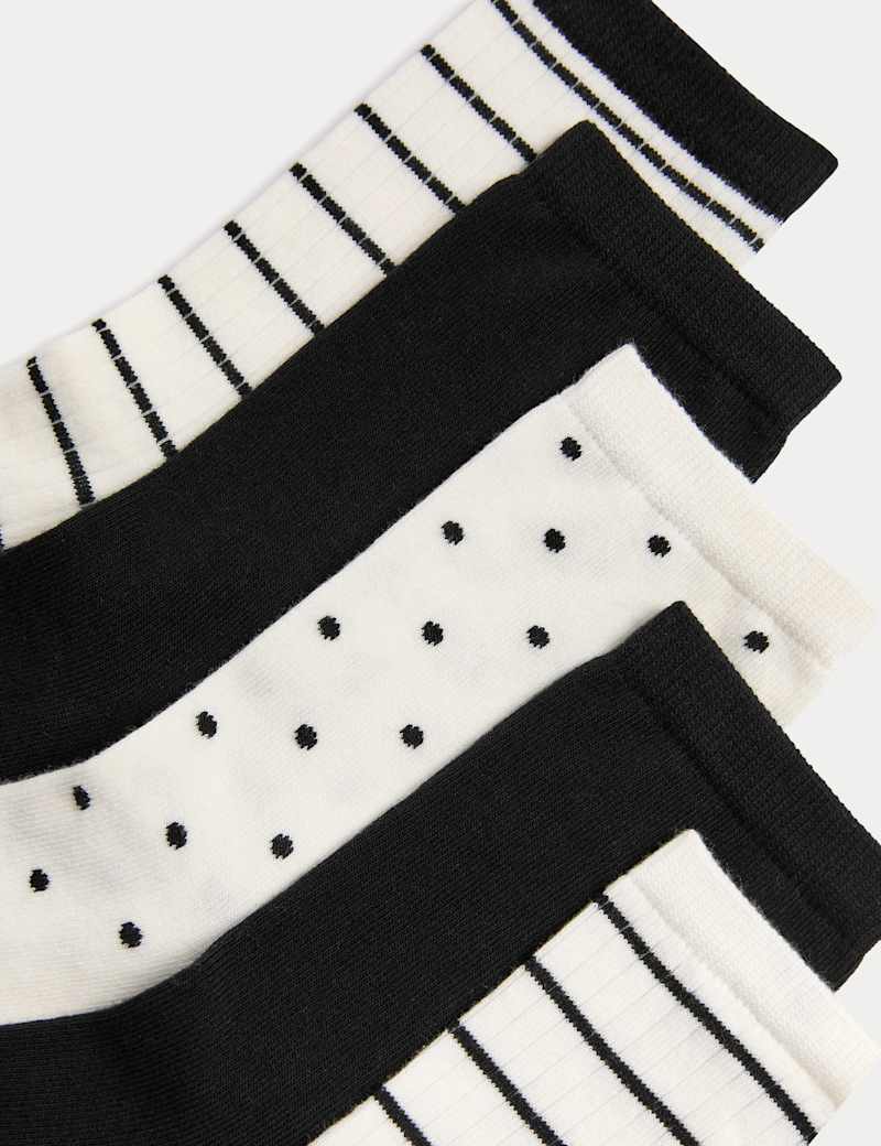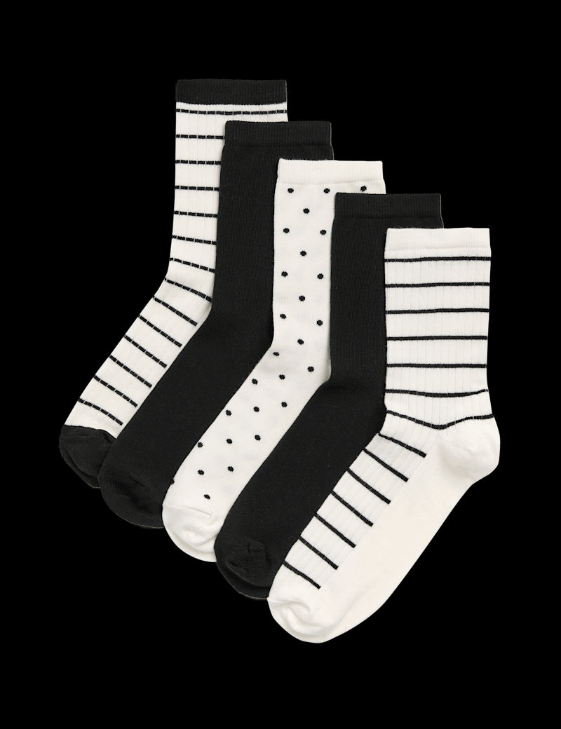 Stock up on everyday essentials with these cotton-rich socks. Ankle-high style, with added stretch for a comfy feel. Handy five-pack contains a mix of plain, striped and spotty designs.