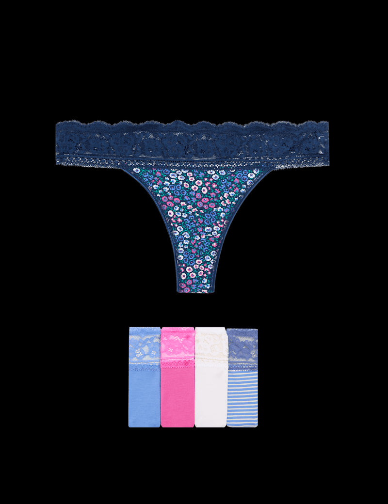 Crafted from a comfy cotton blend, these thongs are true essentials. Made with added stretch for a flexible feel and feature pretty lace detailing along the waist. Five-pack includes three plain pairs, one striped and one with a pretty floral print.