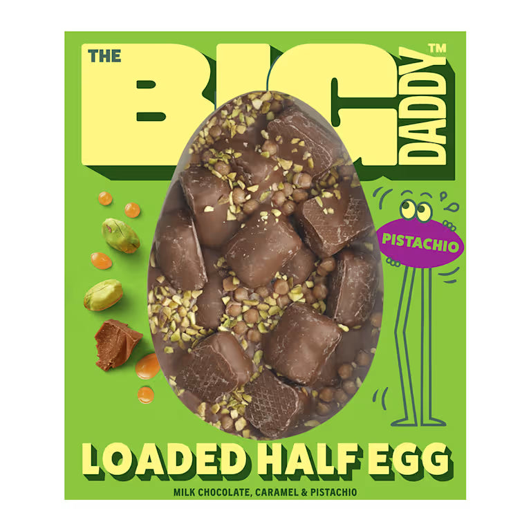 We’ve turned your favourite Big Daddy Bar into an egg! Perfect for pistachio lovers, this extra-thick milk chocolate half egg is layered with soft caramel, chewy caramel pieces and roasted pistachio chunks. Finished with a creamy white chocolate and pistachio centre, it’s a decadent twist on a classic Easter favourite.