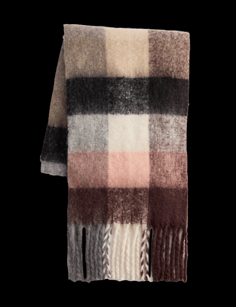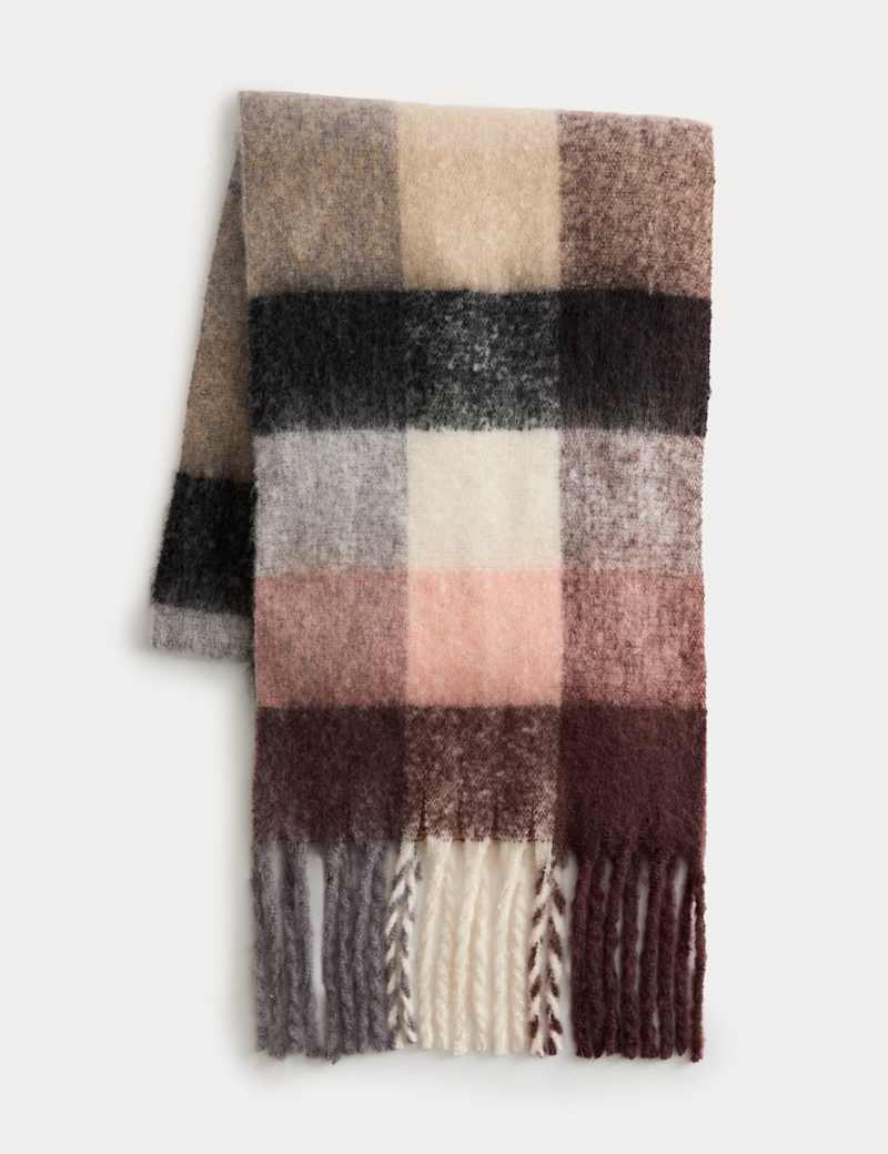 With its brushed texture, this scarf brings a cosy feel to your cold-weather outfits. It's enhanced with a bold checked pattern and finished with tasselled edges for a playful touch.