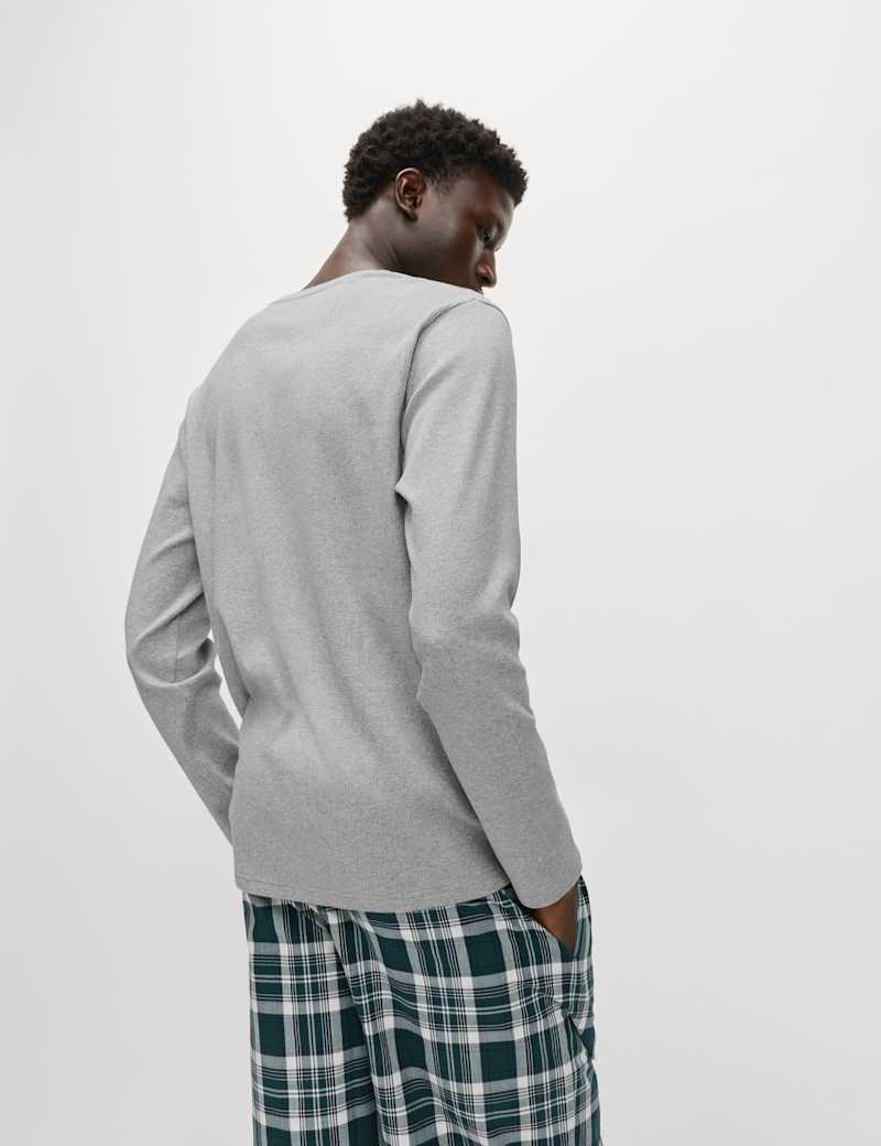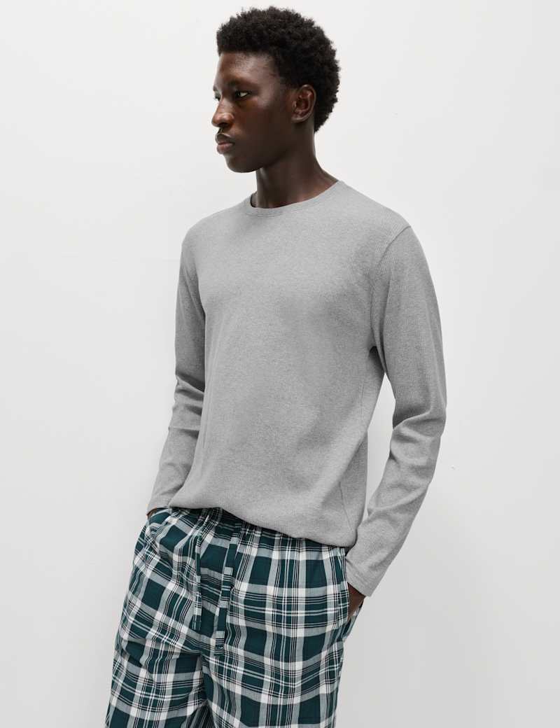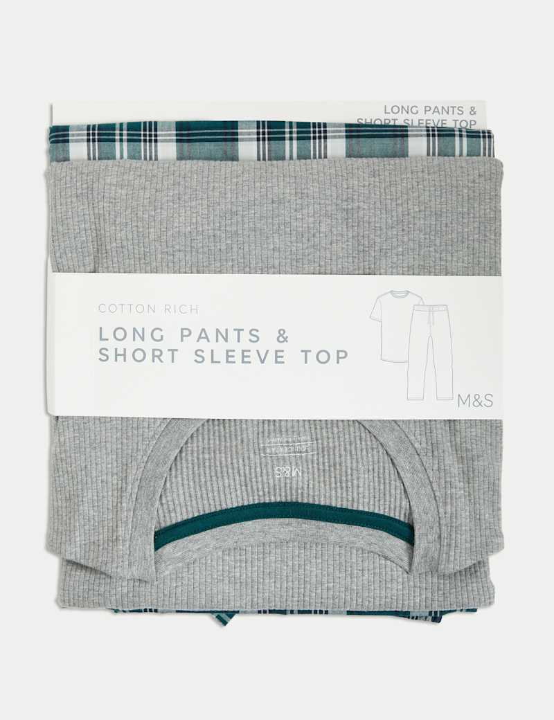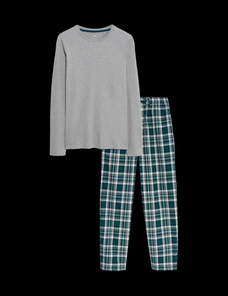 Kick back in comfort with this soft and breathable pyjama set. Made in a regular fit. The pure cotton checked bottoms have a drawstring waist and handy side pockets. There's added stretch in the cotton-rich long-sleeved top to ensure easy wear.