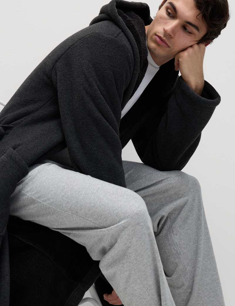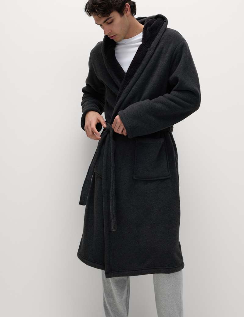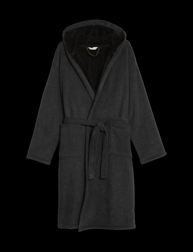 Made from supersoft plush fleece, this dressing gown offers ultrawarmth for cosy evenings at home. Cut to a regular fit with a practical belted waist, this comfortable dressing gown features a hooded neck with a shawl-style collar for extra comfort. Two front pockets provide space for your belongings, while the long sleeves add to the snug feel.