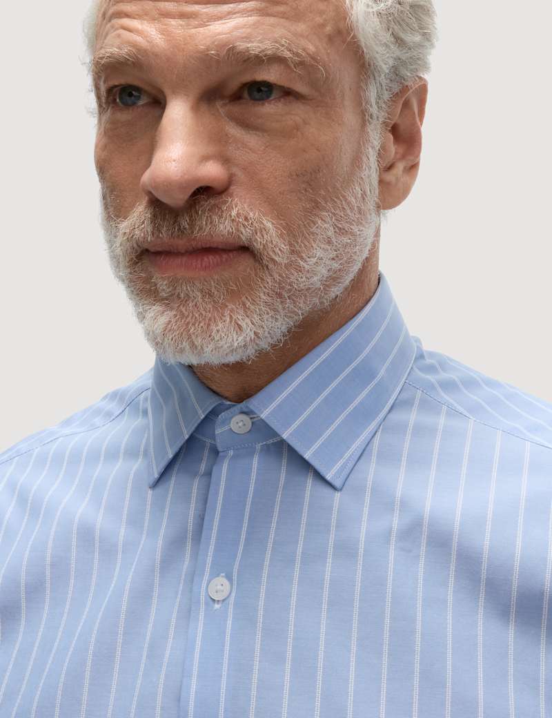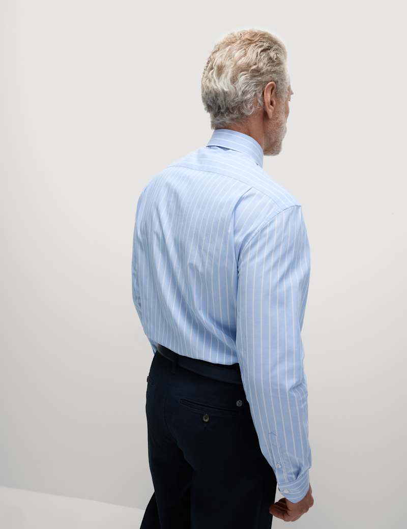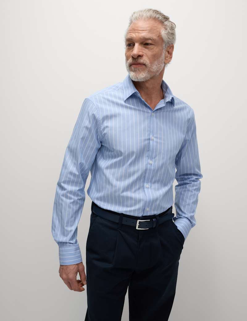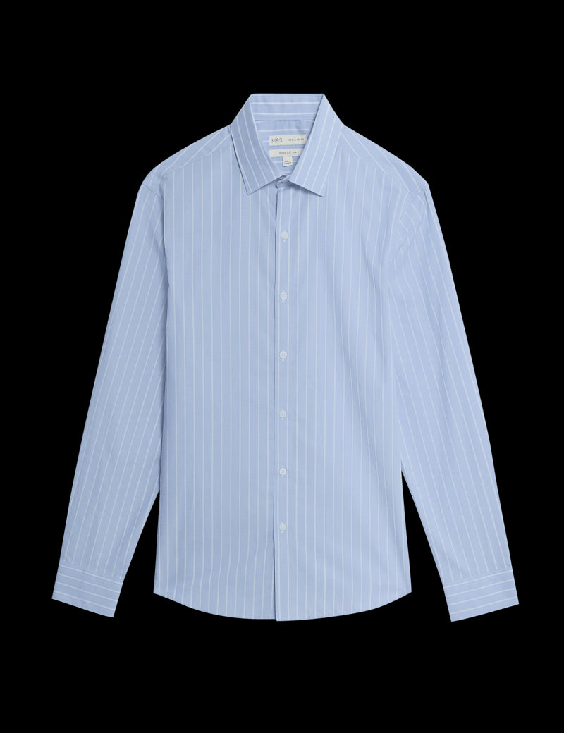 Woven from pure cotton, this smart striped shirt from our M&S Collection offers breathable comfort throughout the day. The regular fit provides a relaxed silhouette that moves with you, while the classic collar and single cuffs maintain a sharp, professional appearance. Thanks to the easy-iron finish, it needs just a quick press to look impeccably smooth and crisp€”perfect for busy mornings when time is of the essence.