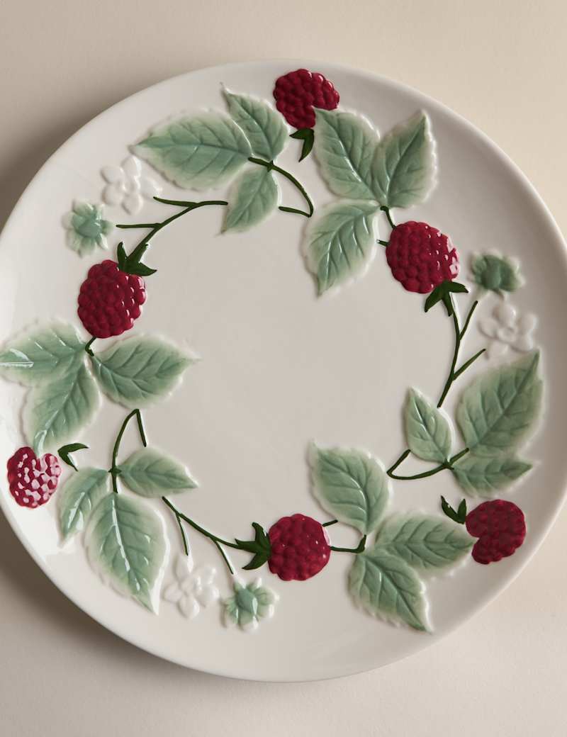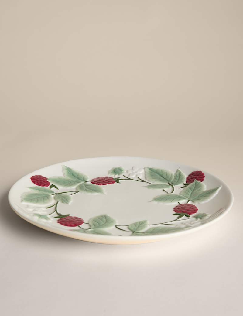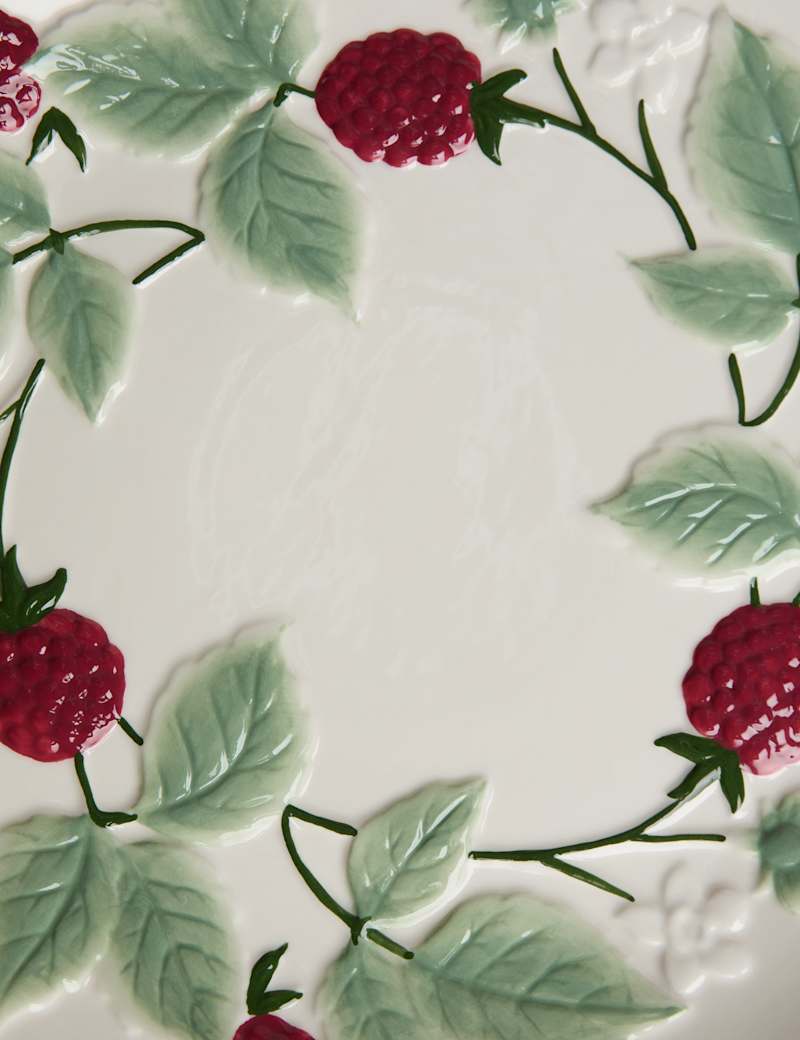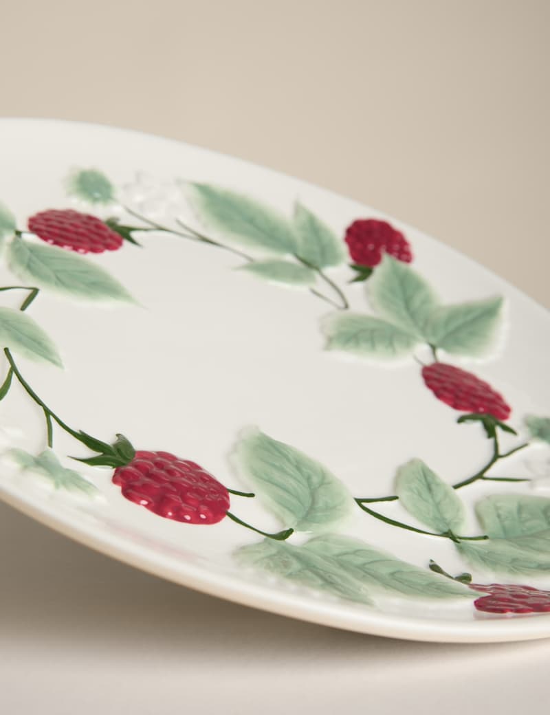 Serve with style using the Bramble Platter. Featuring a charming bramble motif, this stoneware platter brings rustic elegance to any spread. Dishwasher safe.
