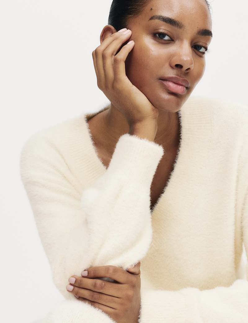 Add a cosy touch to your nightwear with our feather knit pyjama top. Regular fit style with long sleeves and a v-neck. Finished with ribbed trims.