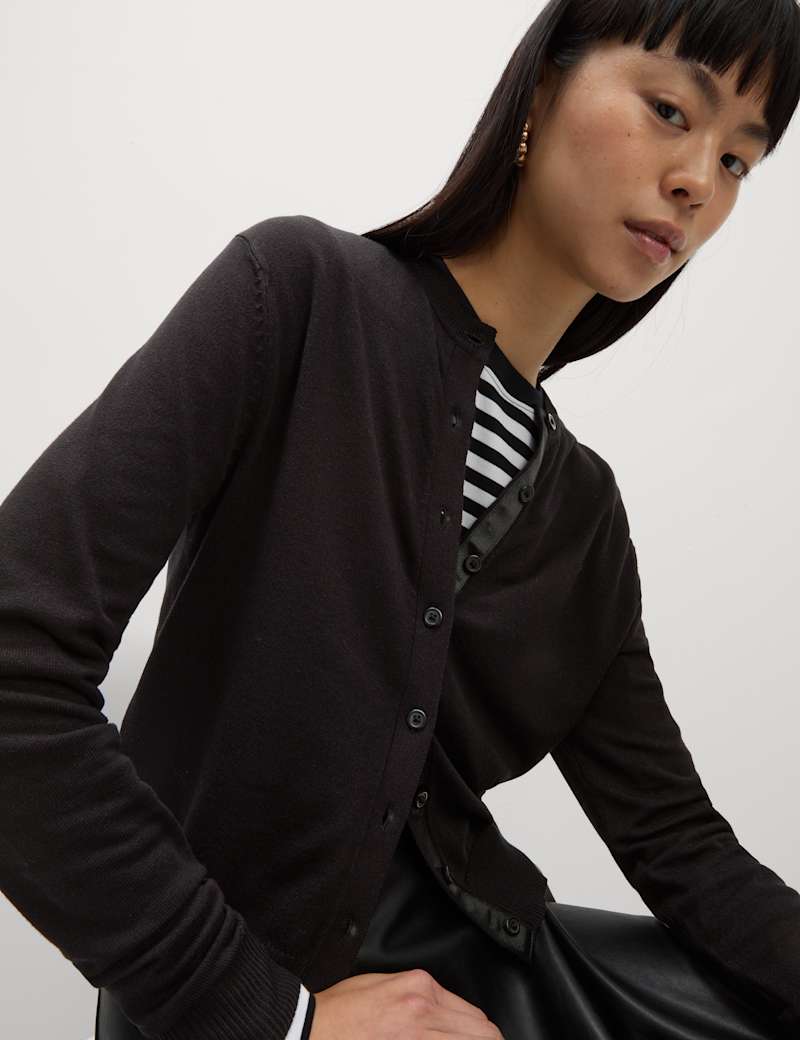 This classic crew neck cardigan with drop shoulder design is a regular fit for everyday versatility. Made from a soft material with long sleeves and neat ribbed trims, the button-through front allows for easy styling. A classic garment that transitions effortlessly between seasons.