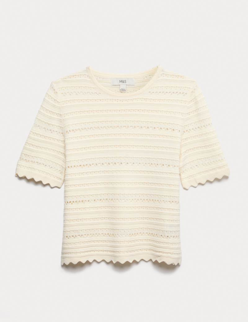 Embrace the textural trend with this cotton-rich knitted top that will mix and match with your separates. The regular-fit piece features horizontal rows of open and closed stitches for an intricate look. It's designed with a simple crew neckline, and charming scallop edging to the short sleeves and hem.