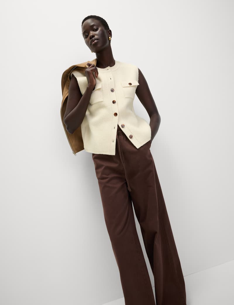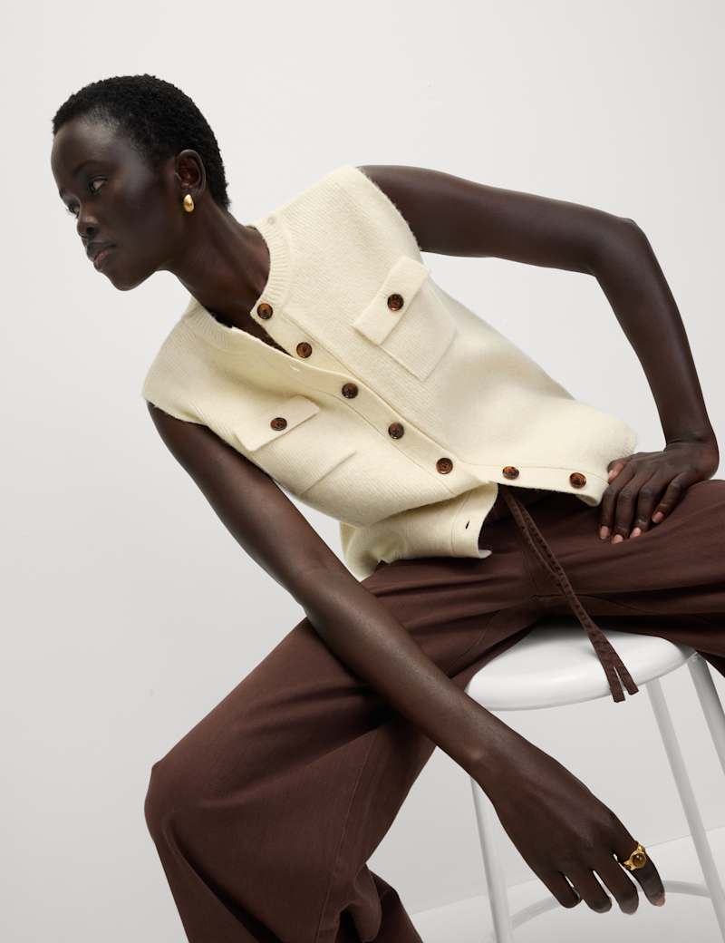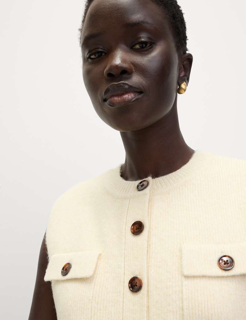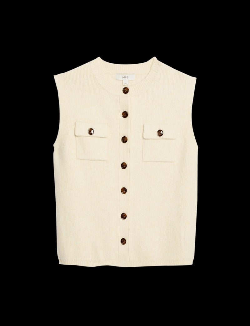 This knitted waistcoat is spun from cloud-yarn for a sumptuously soft feel. It's designed in a regular fit, with a neat button-through front and a timeless crew neckline. Two-buttoned flap pockets put a chic twist on this layering staple, while ribbed trims on the neck and hem bring luxe texture.