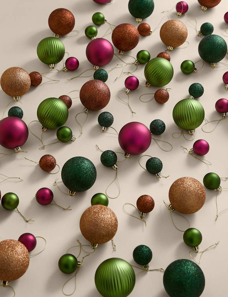 Decorate large trees with our handy pack of 80 baubles. They come in a mix of different sizes, with matte, shiny and glittery textures. Thanks to their shatterproof design, you can keep them in your collection year after year.