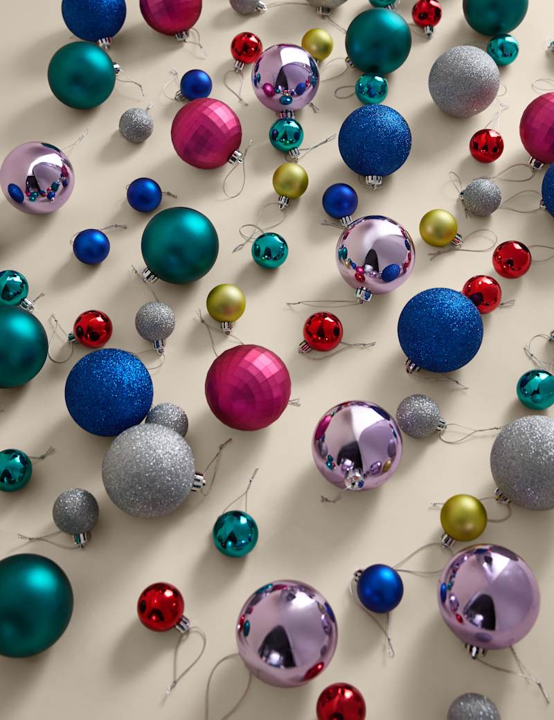 Decorate large trees with our handy pack of 80 baubles. They come in a mix of different sizes, with matte, shiny and glittery textures. Thanks to their shatterproof design, you can keep them in your collection year after year.