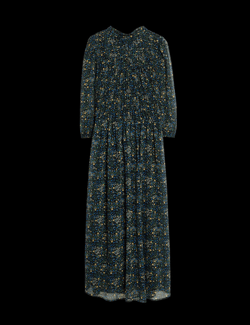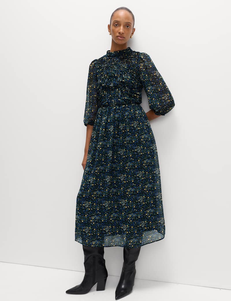 This waisted midaxi dress features a ditsy floral print for a charming look. It's cut to a regular fit, with a high neckline and long sleeves for a sophisticated silhouette. Ruching at the front creates flattering drapes through the fabric. The piece is lined for comfort and finished with a neat button fastening at the back.