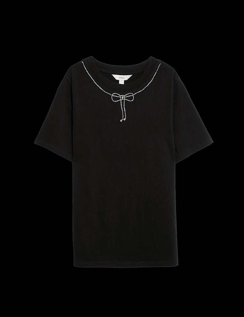 This pure cotton t-shirt is a fun take on a wardrobe staple. Regular fit, with airy short sleeves. The round neckline features an embellished bow design for a playful finish.