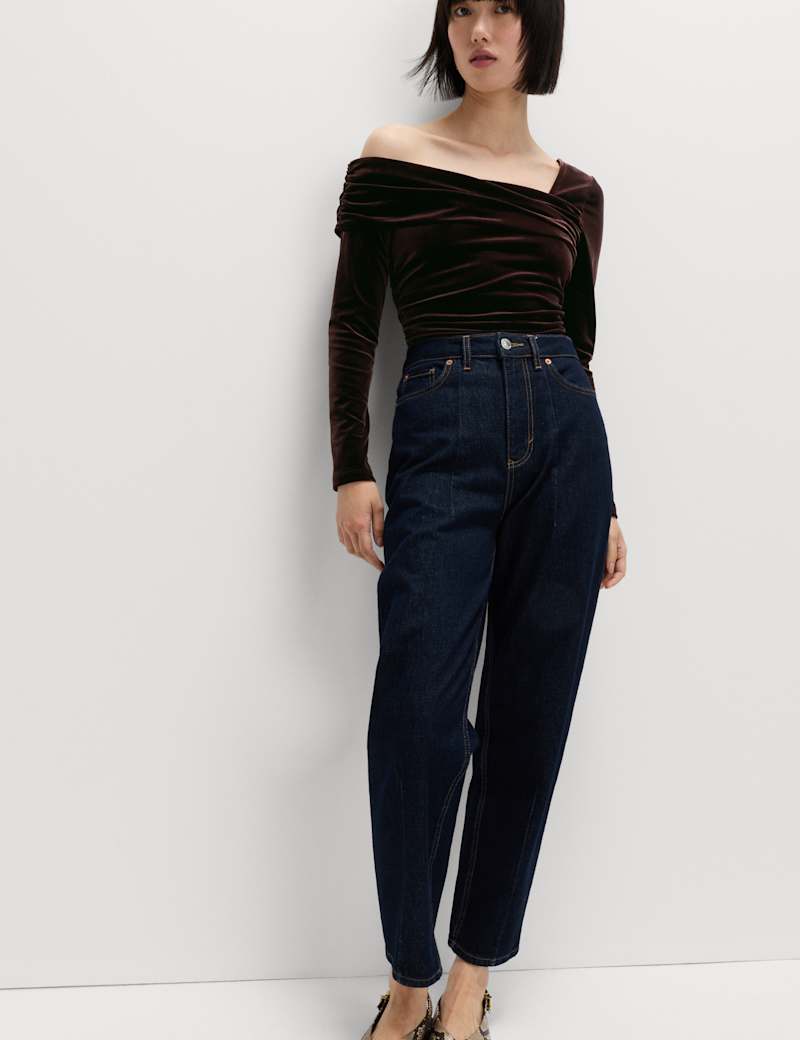 This elegant top is made from sumptuous velvet for a luxurious design. The flattering fitted shape is complemented by an asymmetric neckline. Ruching at the front adds texture and contemporary detail.