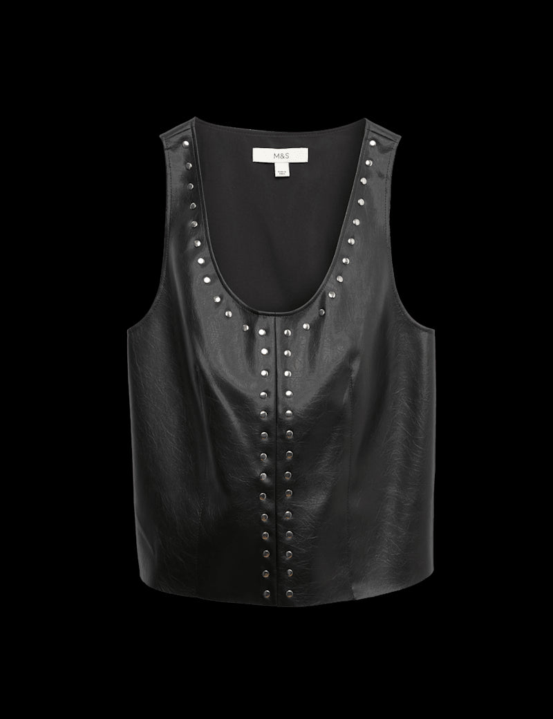 Give your look a glam-rock edge with this faux leather top. It's designed in a regular fit, with sleeveless silhouette featuring a low round neckline. Stud embellishments add bold texture and a touch of attitude.