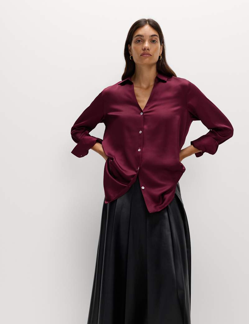 This shirt is crafted from sumptuously smooth satin for a luxurious feel. It's designed in a regular fit, with a smart collared V-neck and a button-through front. The long sleeves finish in neat cuffs.