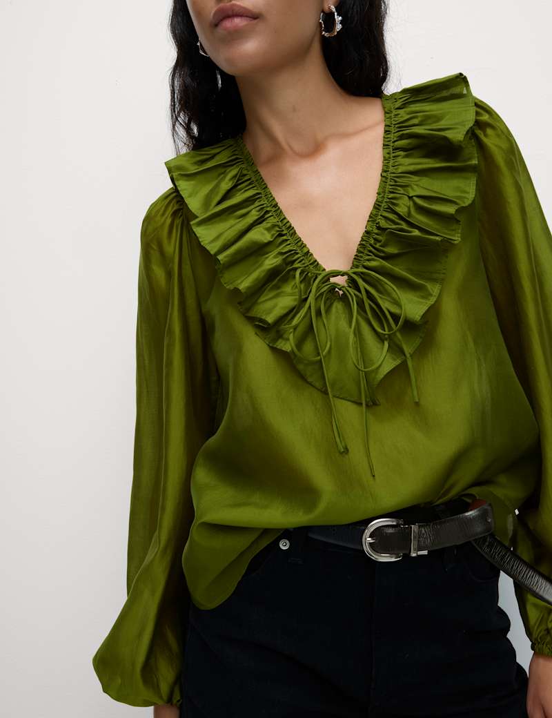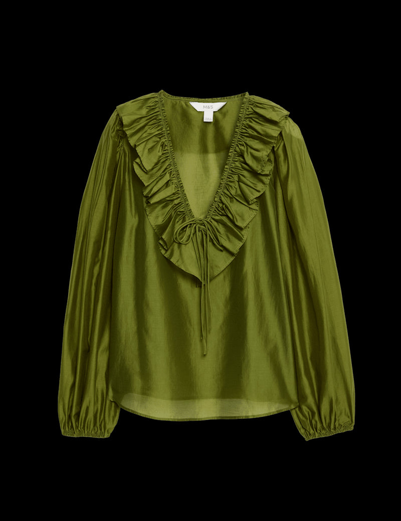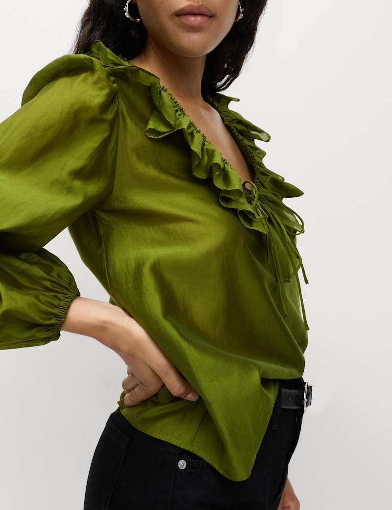 This v-neck top is crafted from lyocell-rich fabric for a beautifully light and elegant feel. It's cut to a regular fit, with long sleeves that gather into elasticated cuffs. A v-neckline with a tie detail and frills adds a romantic flourish.