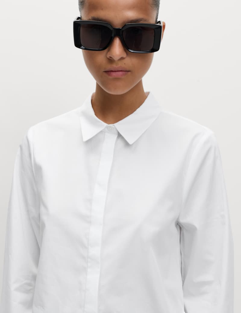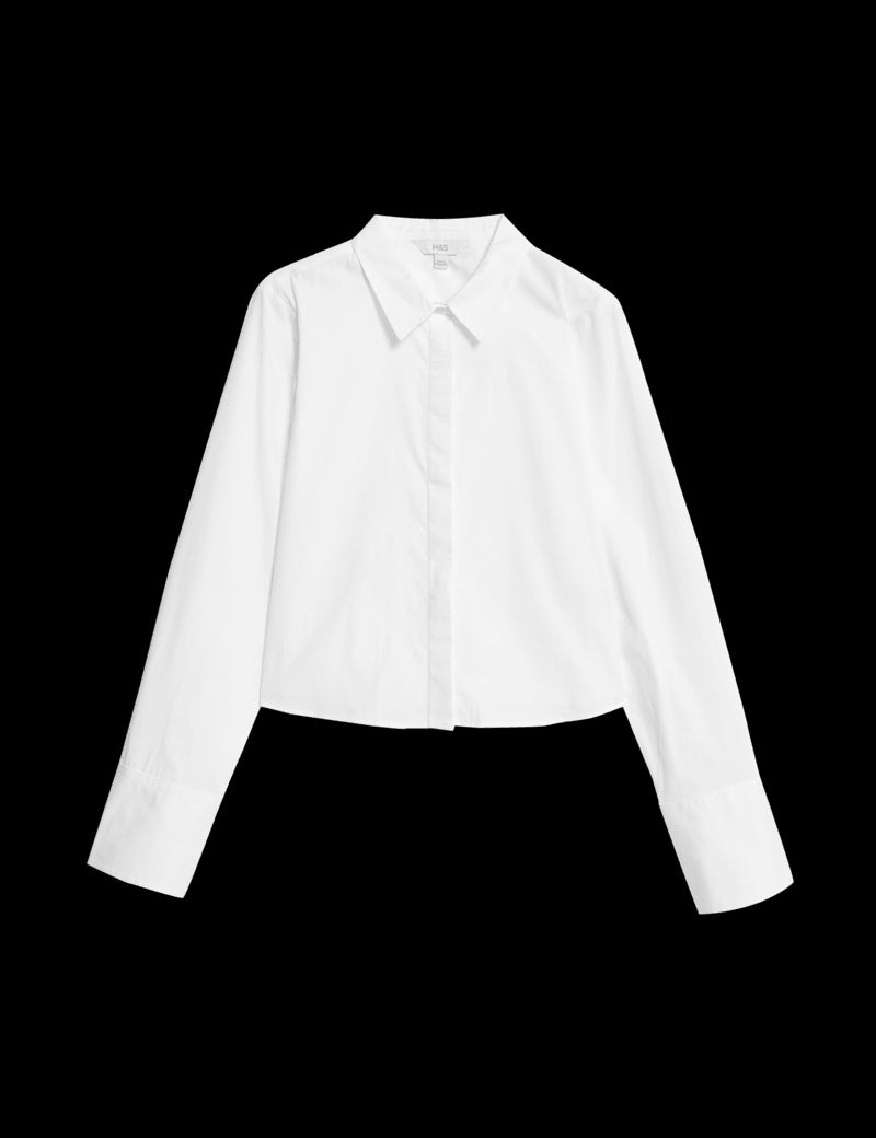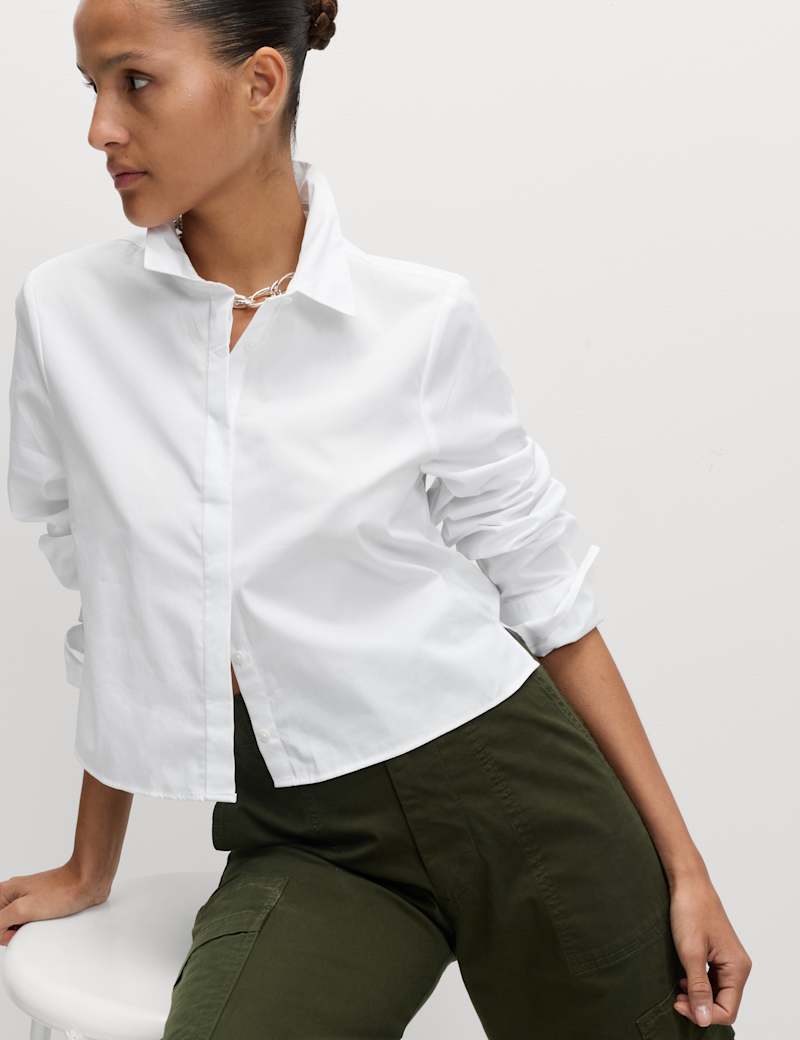This pure cotton shirt delivers a standout silhouette. Made in a contemporary cropped fit, with a neat collared neckline and a concealed button fastening for a streamlined look. It's finished with deep two-button cuffs on the airy long sleeves.