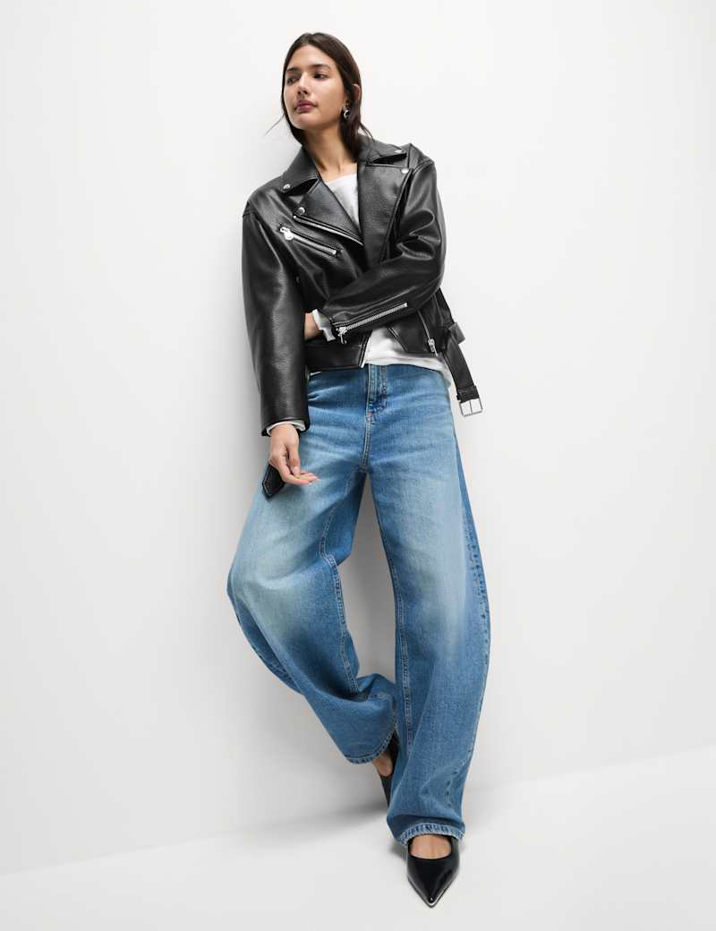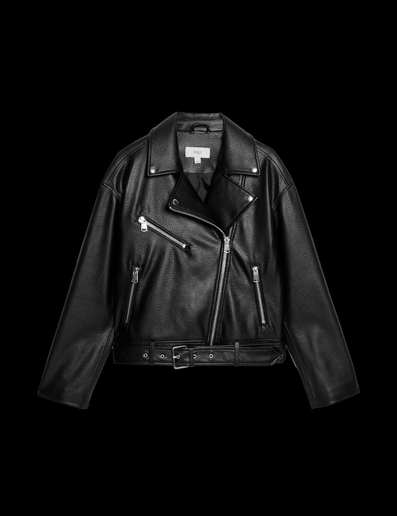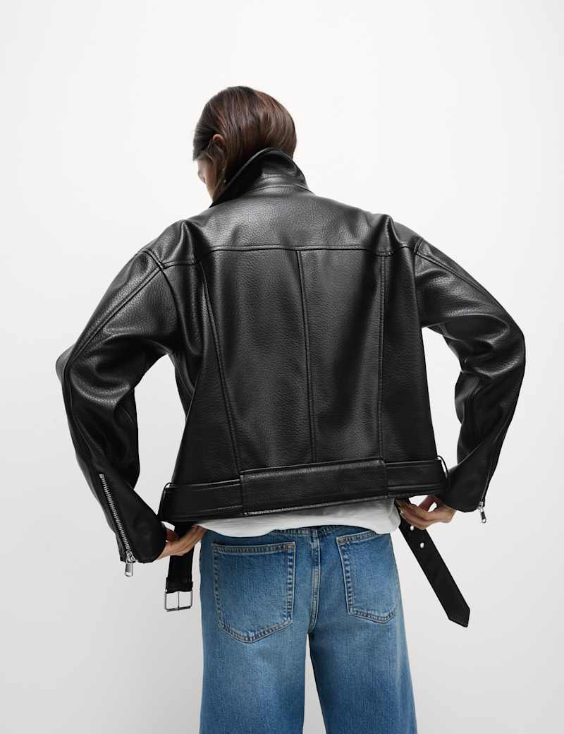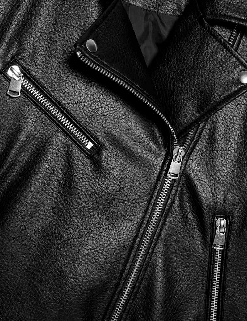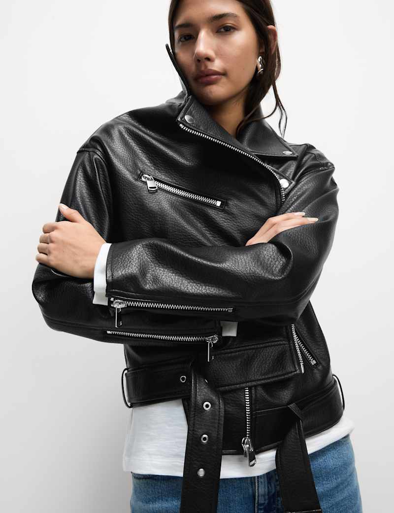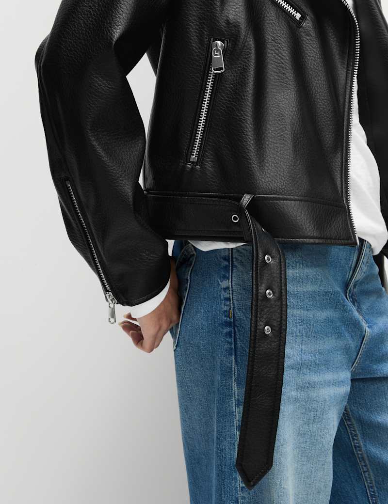This textured biker jacket is made from grained faux leather, giving you an authentic motorcycle-inspired look without the real thing. Its regular fit with a boxy silhouette creates a classic edge, while the belt detail at the hem adds signature biker styling. The off-centre zip fastening provides a contemporary touch, and two side pockets keep your belongings secure. Inside, this outerwear coat is fully lined for a smooth feel against your skin and easy layering.