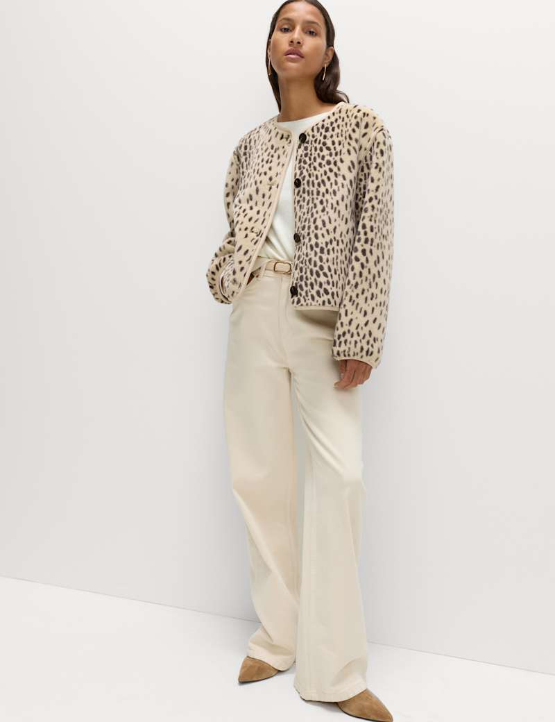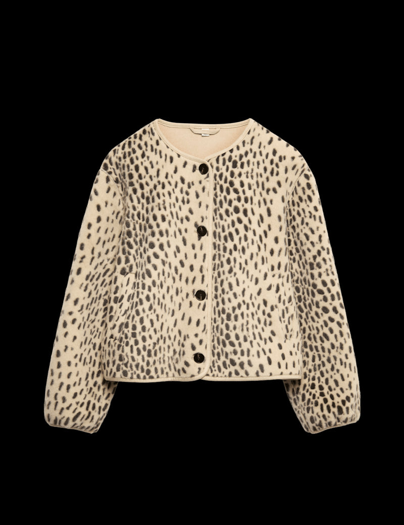 Made from soft faux fur with a statement animal print, this jacket is a playfully elegant piece. It's cut to a relaxed fit, with a neat collarless neckline and button fastenings through the front. The shoulders are slightly dropped for a laid-back air, while the two side pockets add handy detail.