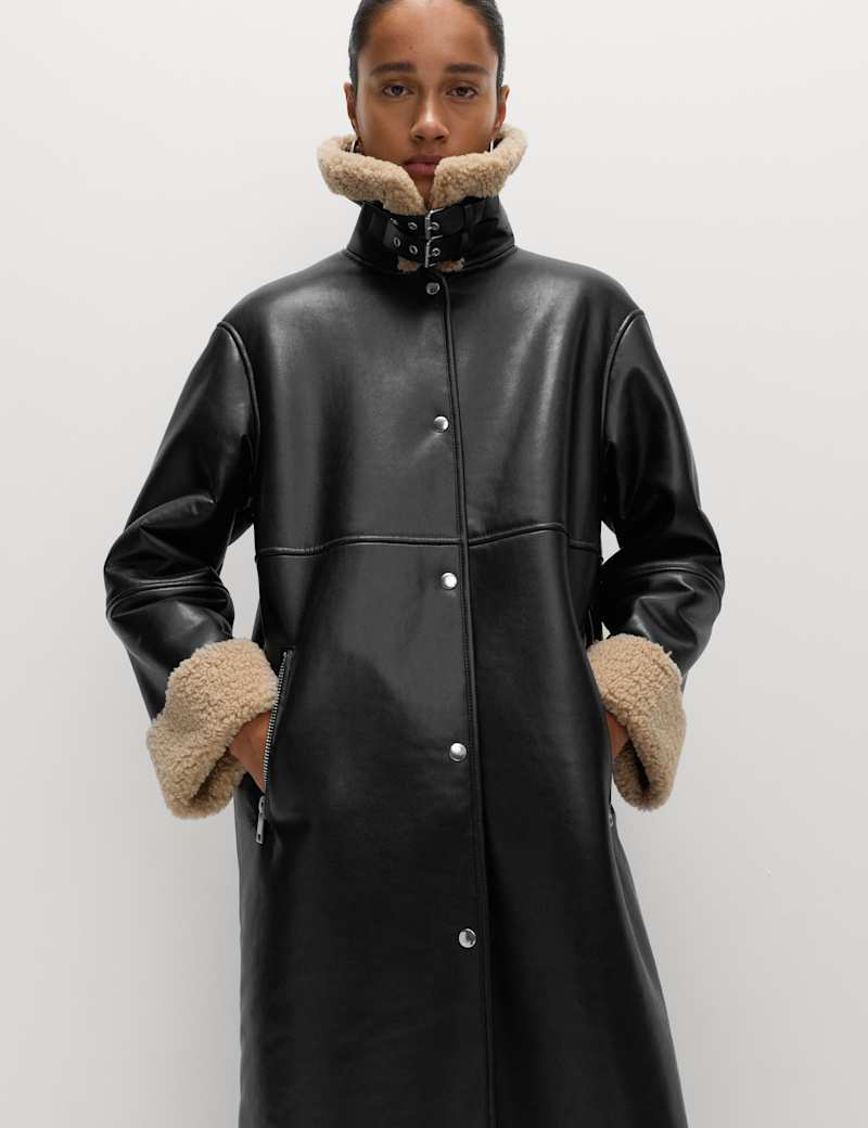 Inspired by aviator jackets, this faux-shearling longline coat is a stylish way to stay cosy. The regular-fit design fasten with a row of press studs while a seam at the waist creates a flattering shape. Buckles on the fleecy on the collar can be fastened to create a super-cosy funnel neck. Two zipped pockets at the hips complete the design.