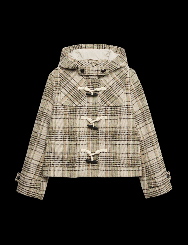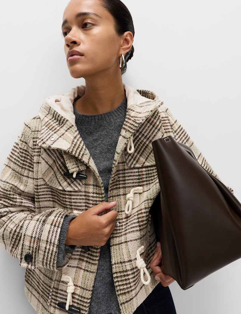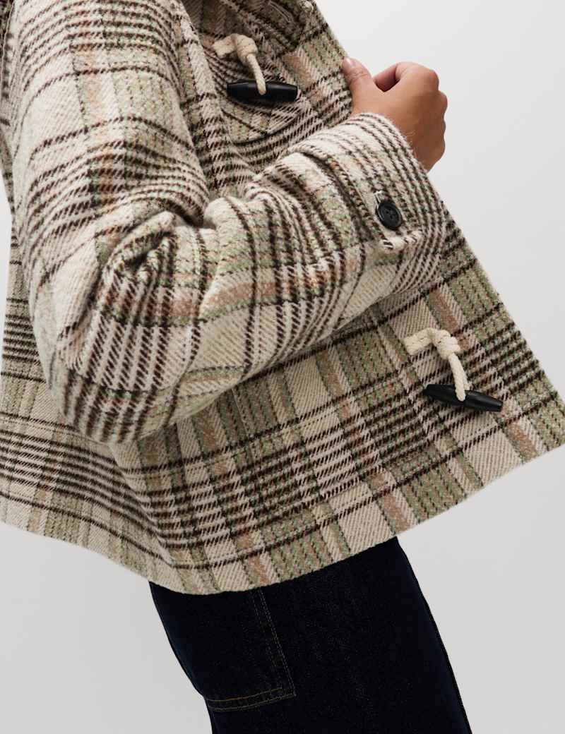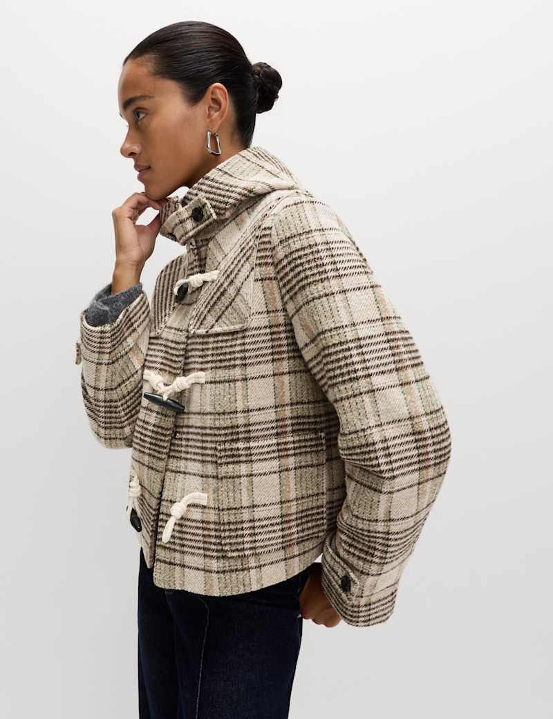 This duffle coat in jacket style is crafted with soft wool in the fabric for a luxurious feel. It's cut to a regular fit, with a hood and toggle fastenings for a traditional look. An internal zipped pocket and two front patch pockets provide plenty of space for your essentials, while the all-over check print adds a timeless finish.