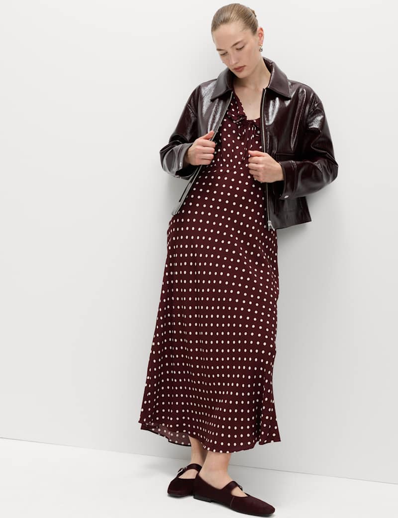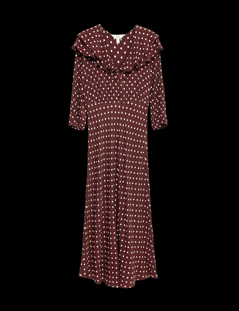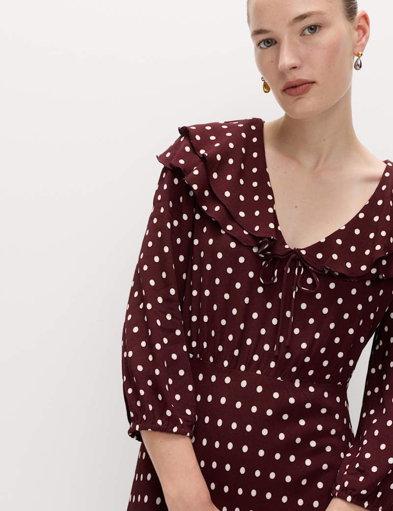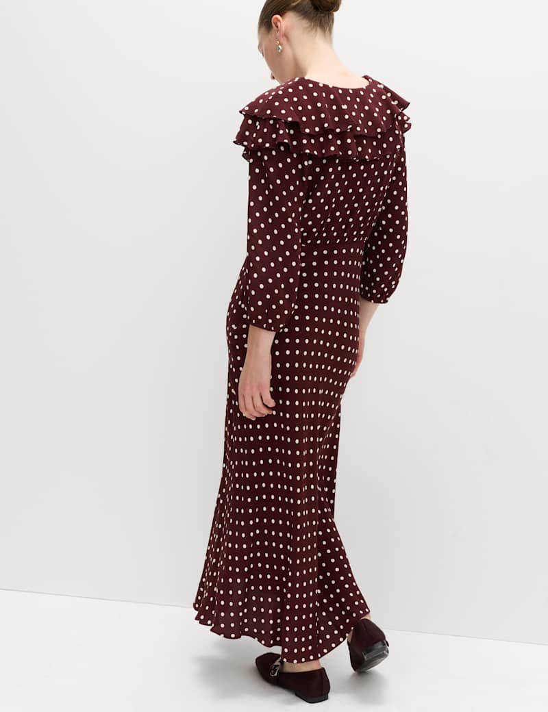 This polka dot dress channels timeless vintage charm with its playful print and feminine details. It's cut in a regular fit, with a flattering v-neckline trimmed with a ruffled collar and tie detail. The midaxi length and gently puffed sleeves complete the romantic silhouette.