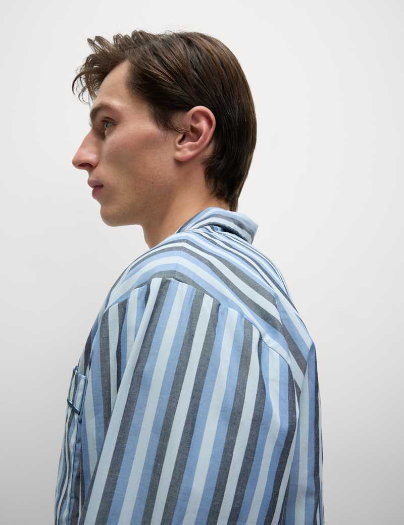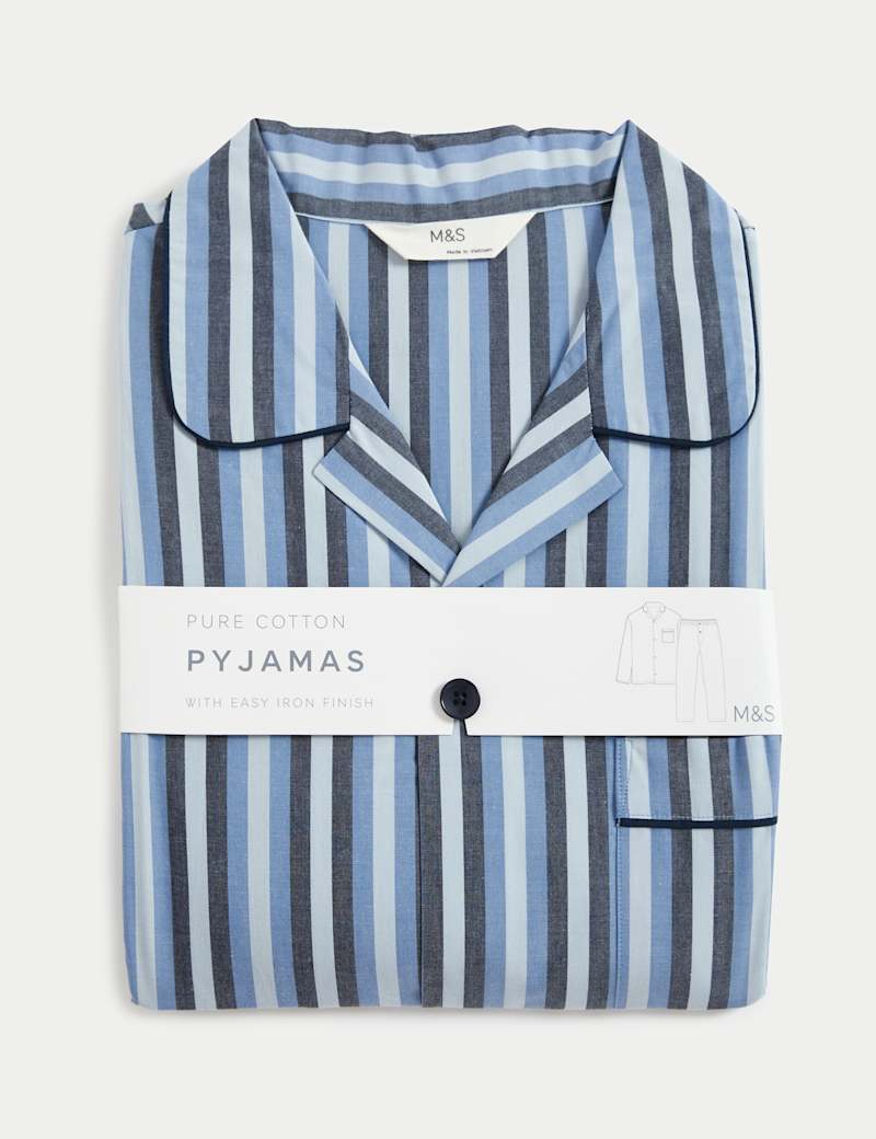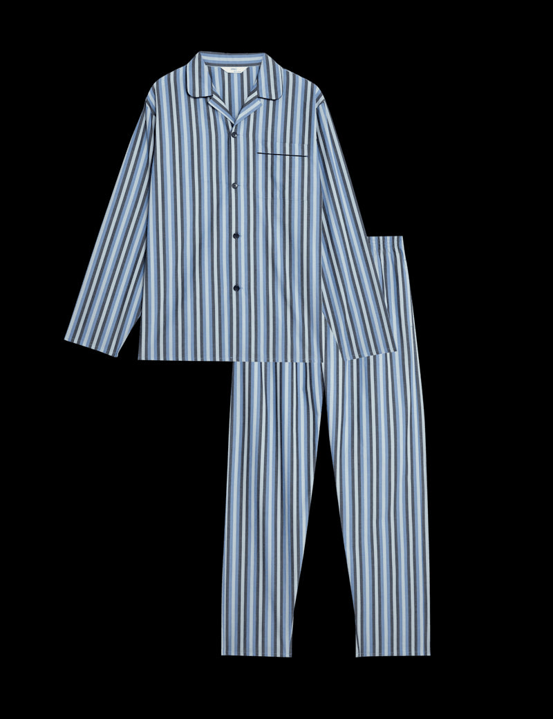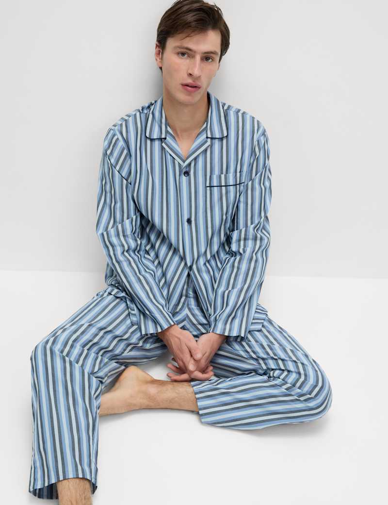 Sleep in comfort and style with this pure cotton pyjama set. Made to a comfy regular fit. Long-sleeved top has a smart collared neckline and a handy chest pocket. The bottoms feature a neat fly opening, an elasticated waist and handy side pockets. Complete with a multi-striped design.