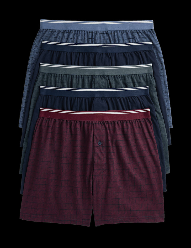 These pure cotton jersey boxers are made with our StayNew™ technology for longer-lasting wear. Regular fit, with a loose cut and a functional button fly. Cool & Fresh™ finish keeps you feeling dry all day. Pack of five pairs includes geometric tile prints in various colourways.