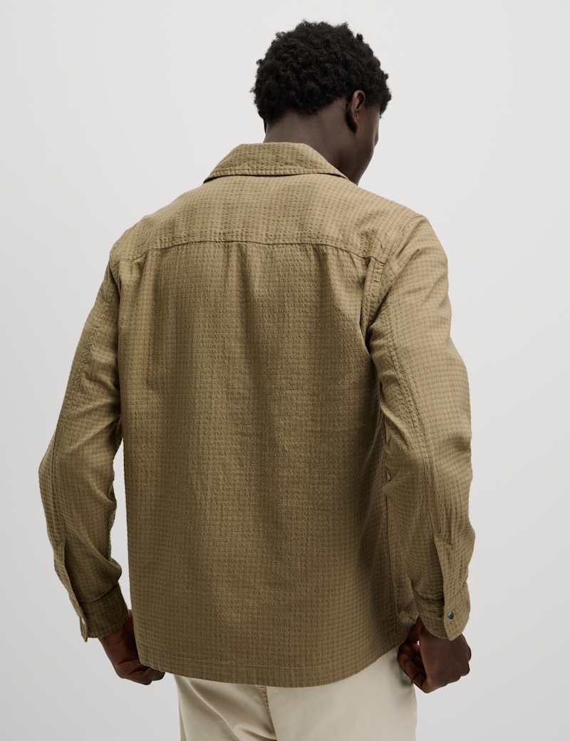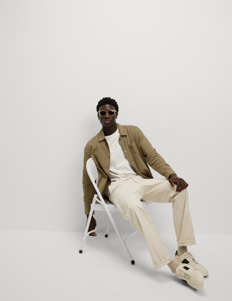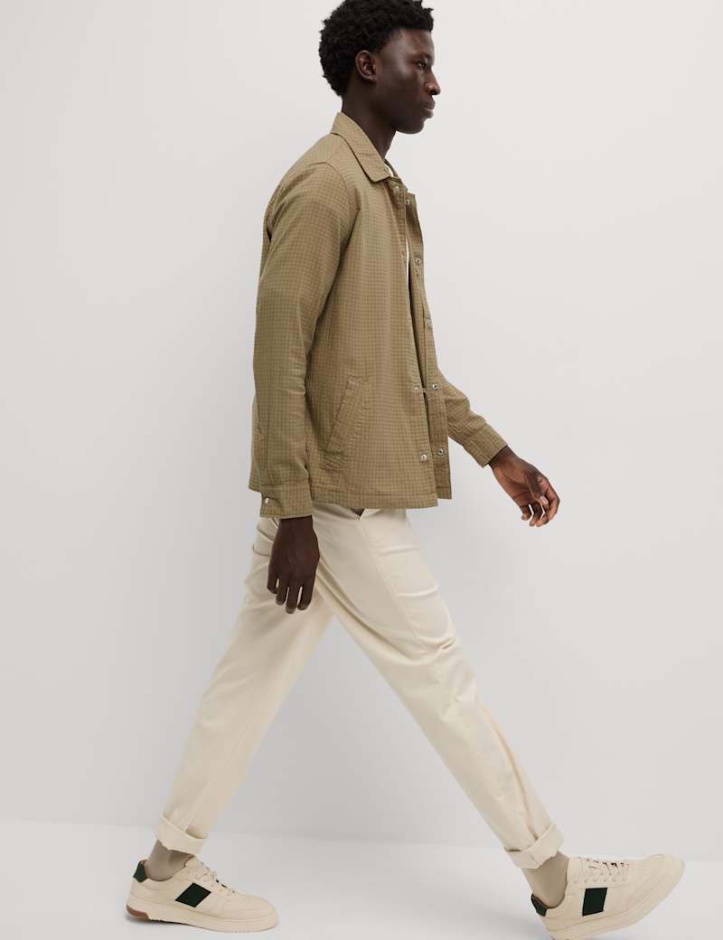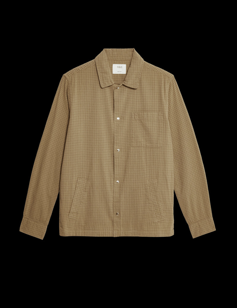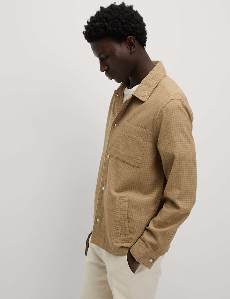 This cotton-rich overshirt is a versatile layering piece for those in-between days. Made to a comfy regular fit with a classic collar and a popper fastening. The subtle checked pattern gives it a versatile smart-casual look. Two chest pockets keep your essentials handy, while side-entry pockets are ideal for warming hands.