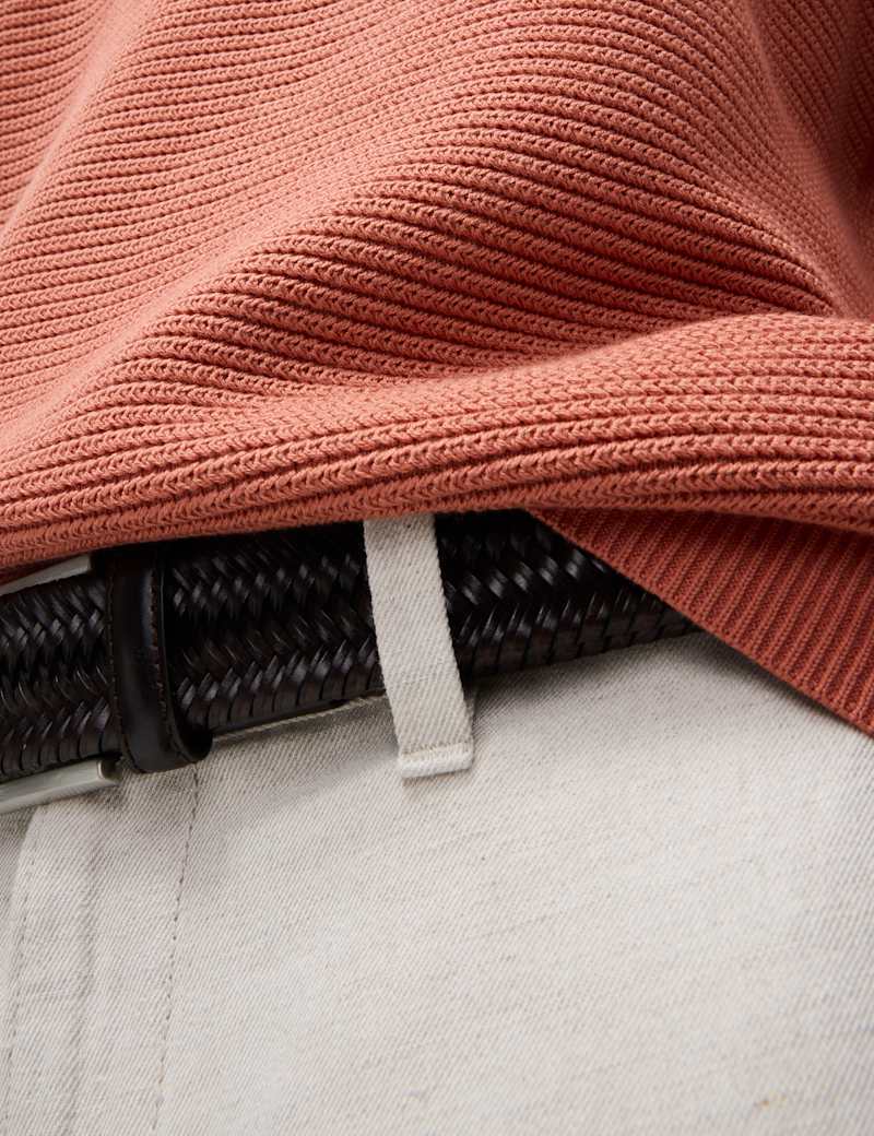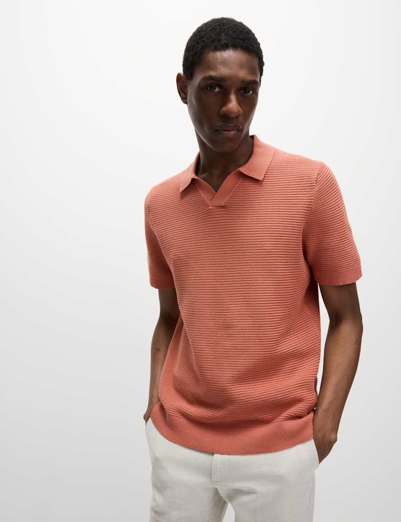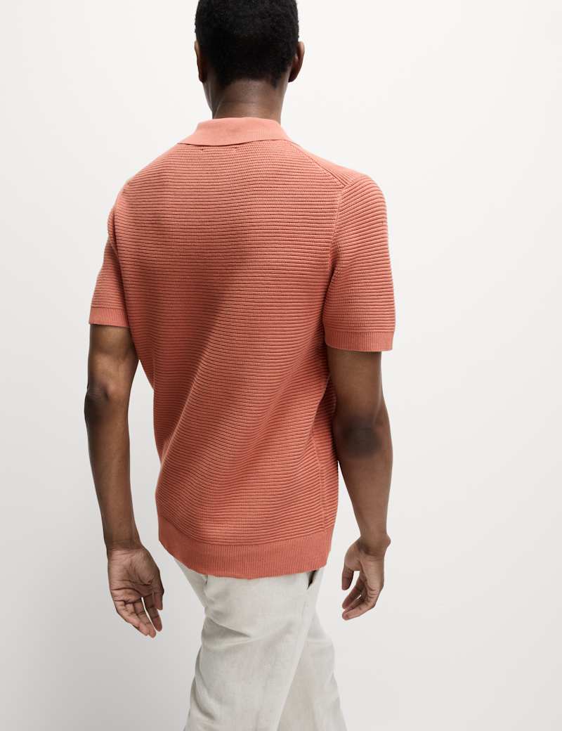 With its on-trend open neck, this knitted polo shirt looks cool and casual. It's made from pure cotton for softness and breathability. The textured weave and garment dyed fabric enhances its rich colour and gives it a lived-in look. The ribbed trims fit snugly.