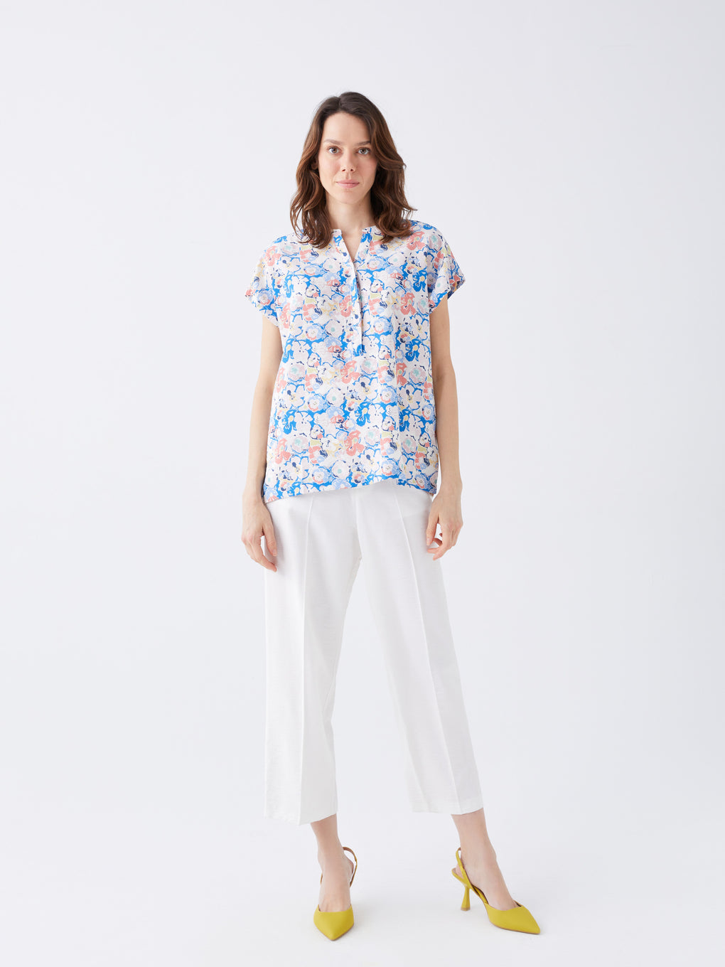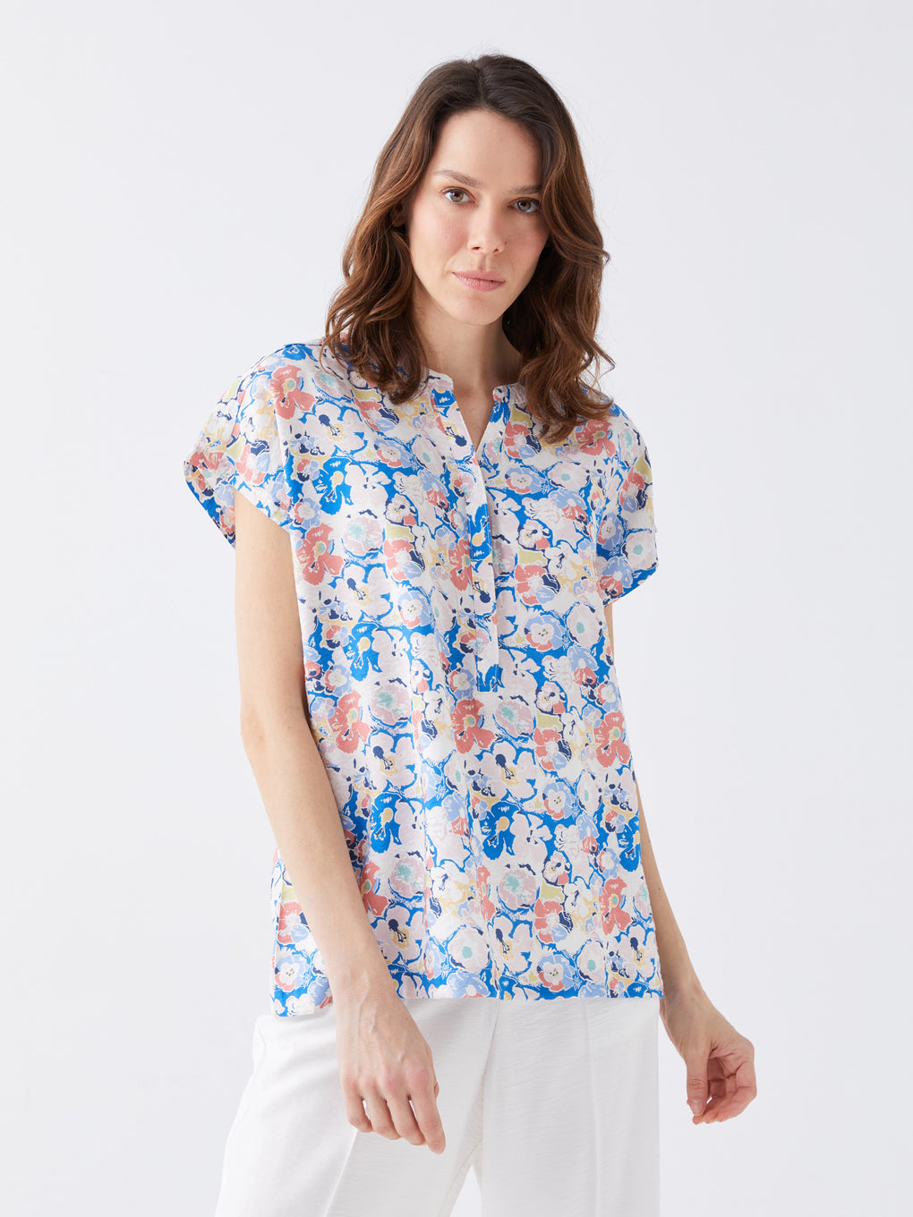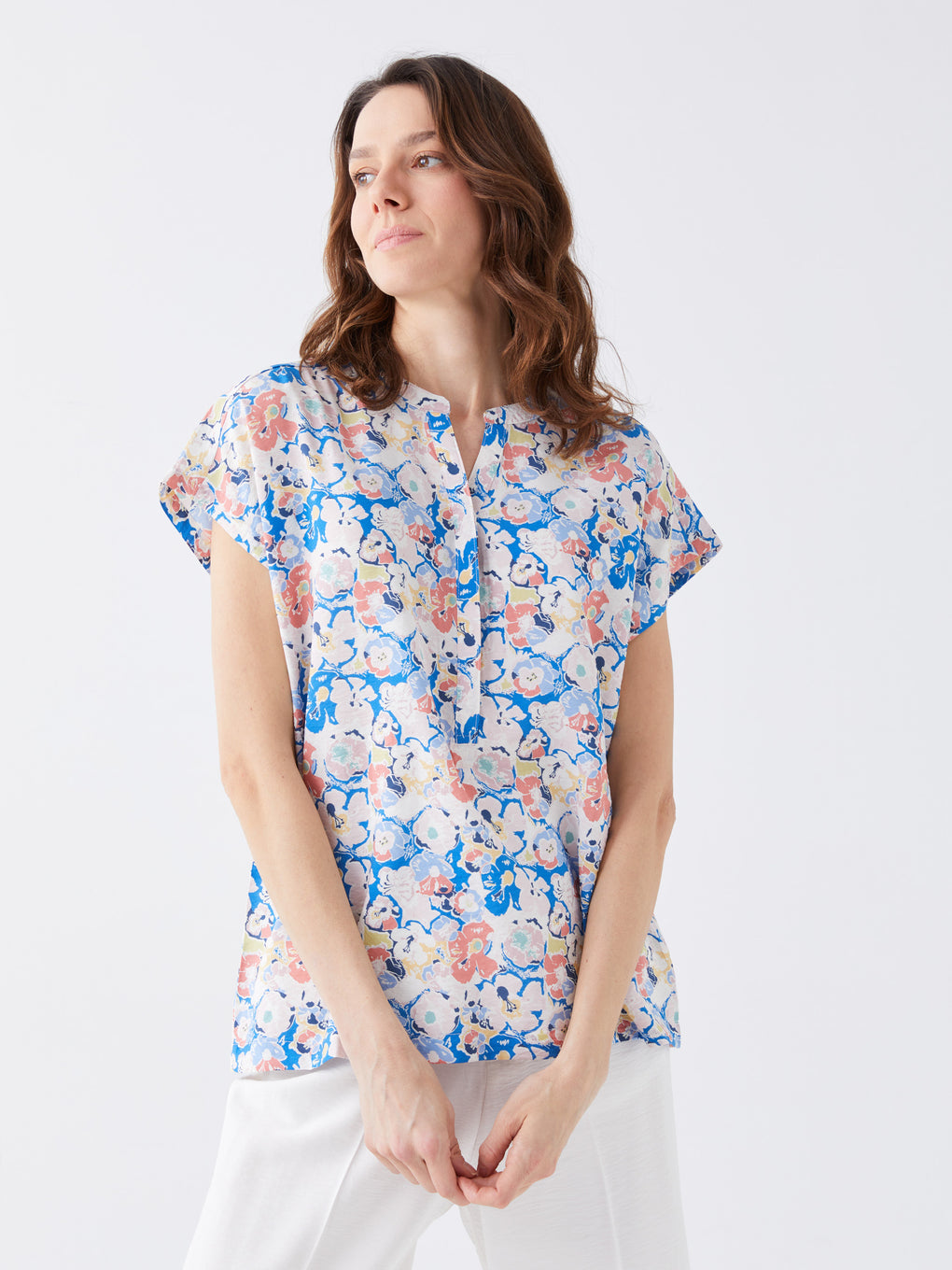 Henley Neckline Floral Short Sleeve Women's Blouse