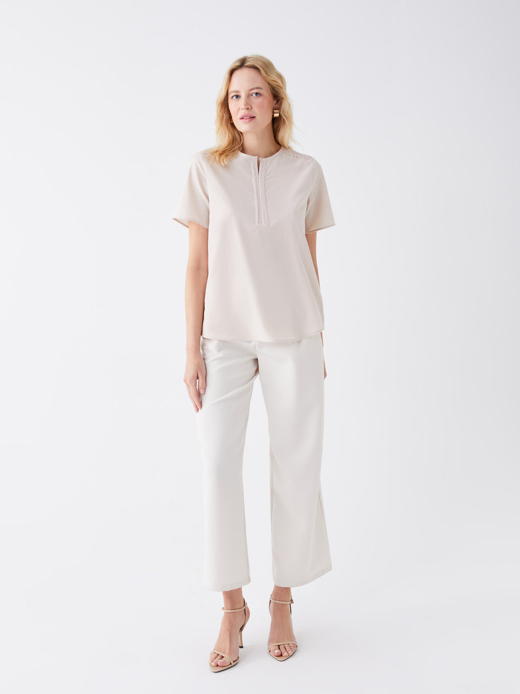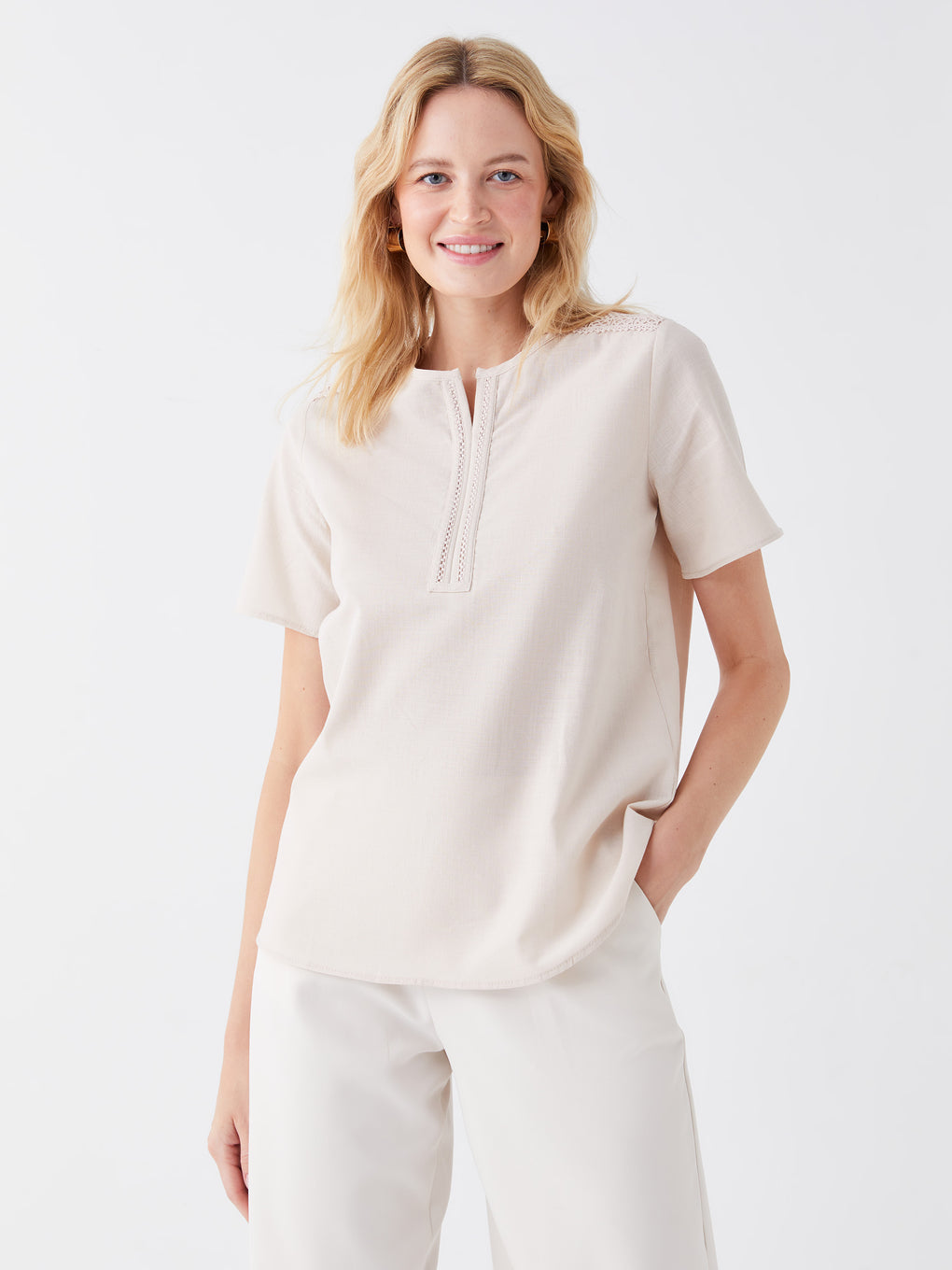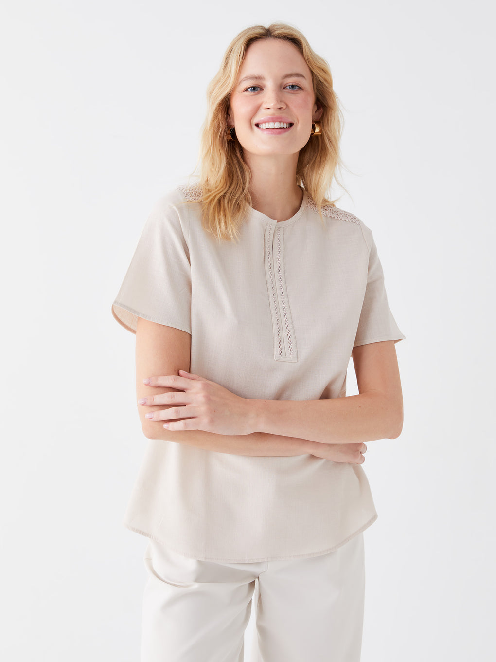 Henley Collar Self-Patterned Short-Sleeve Women's Blouse