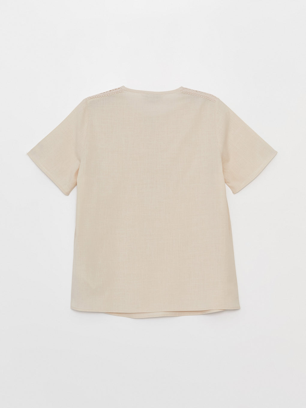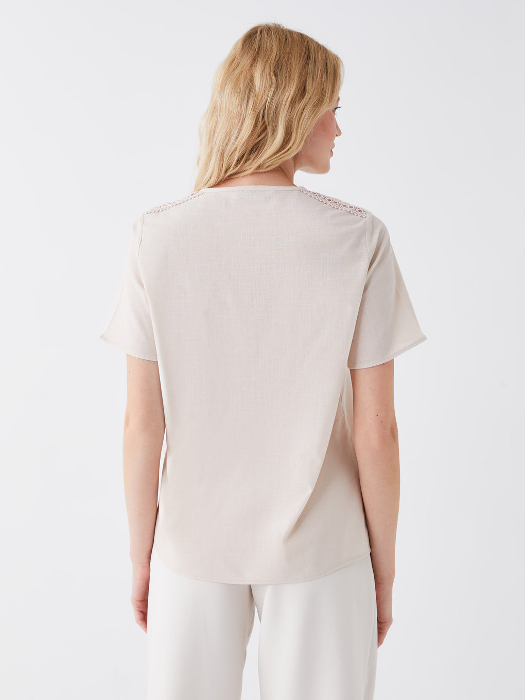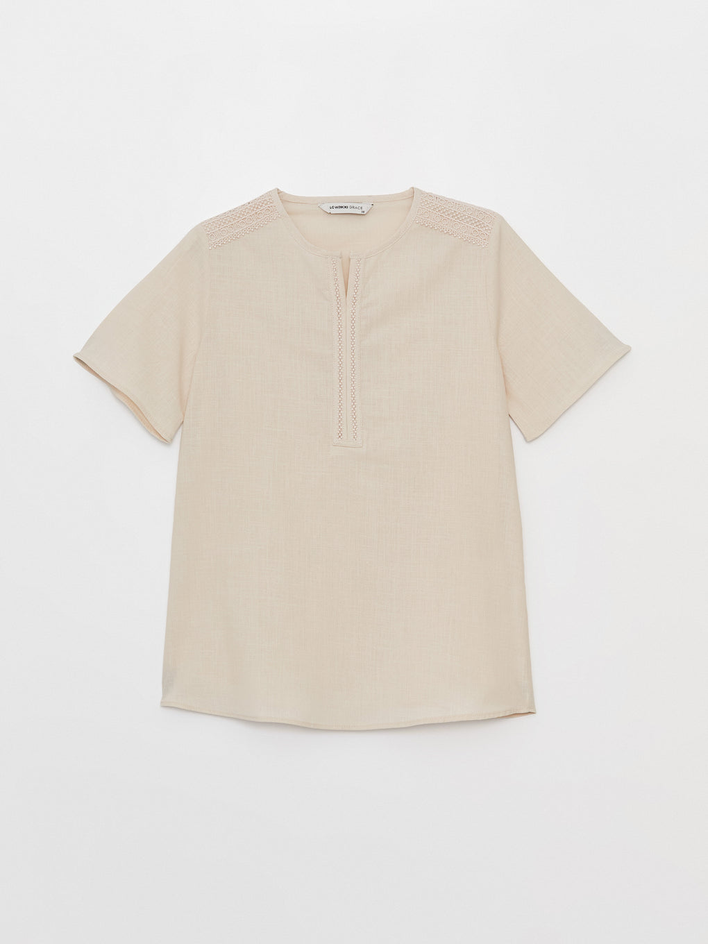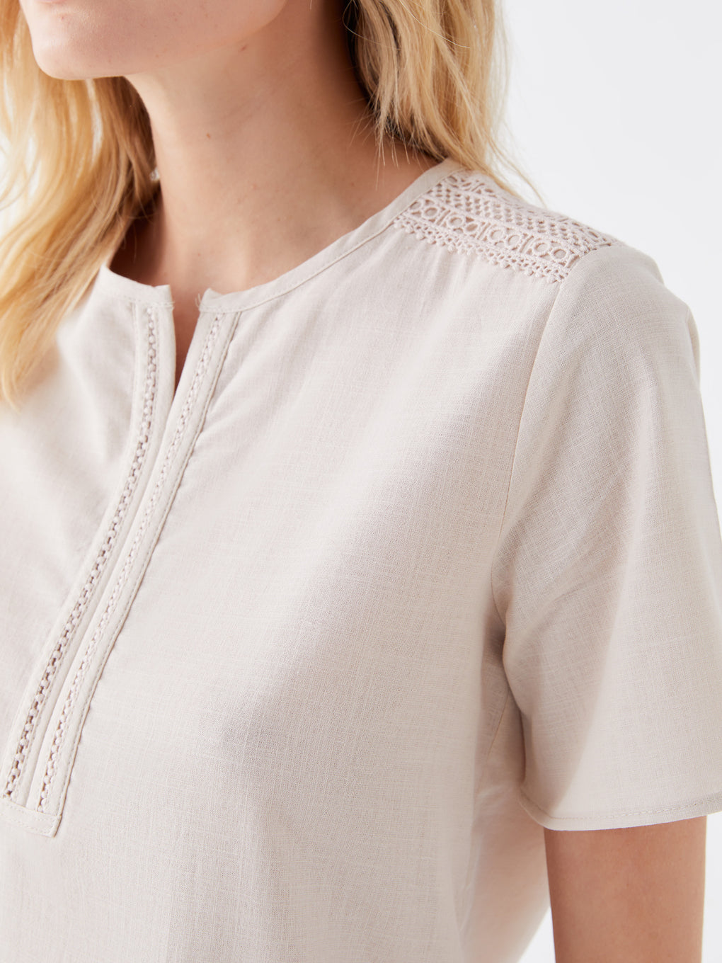 Henley Collar Self-Patterned Short-Sleeve Women's Blouse