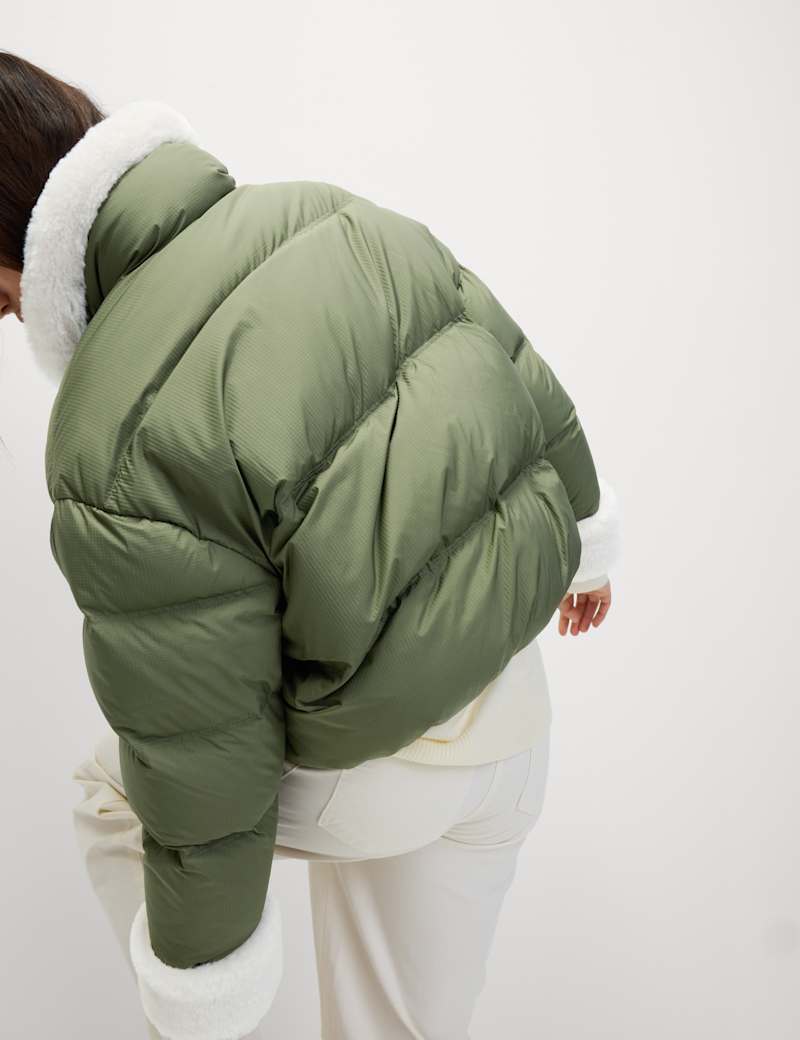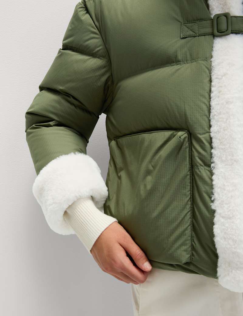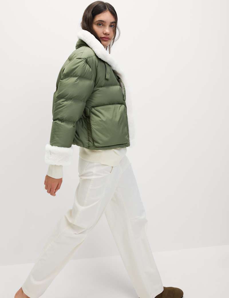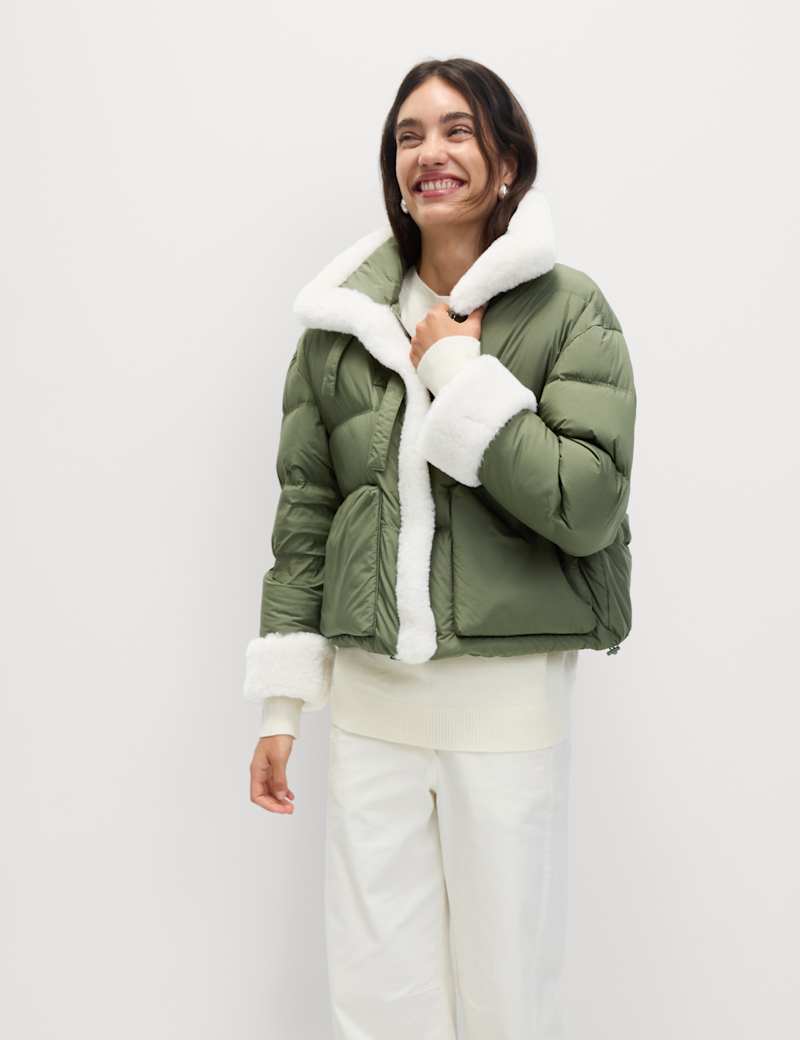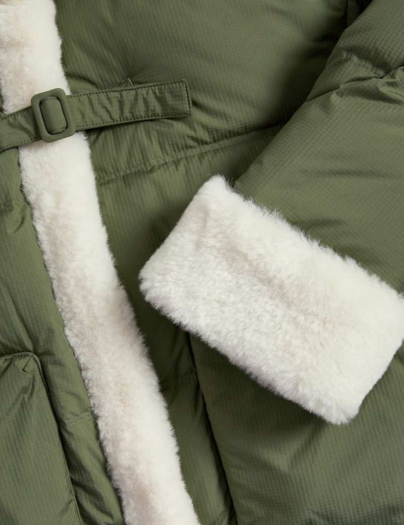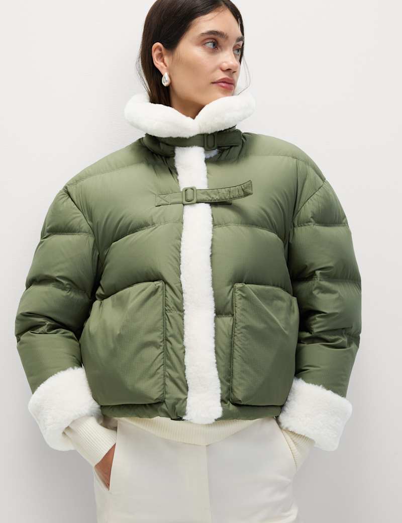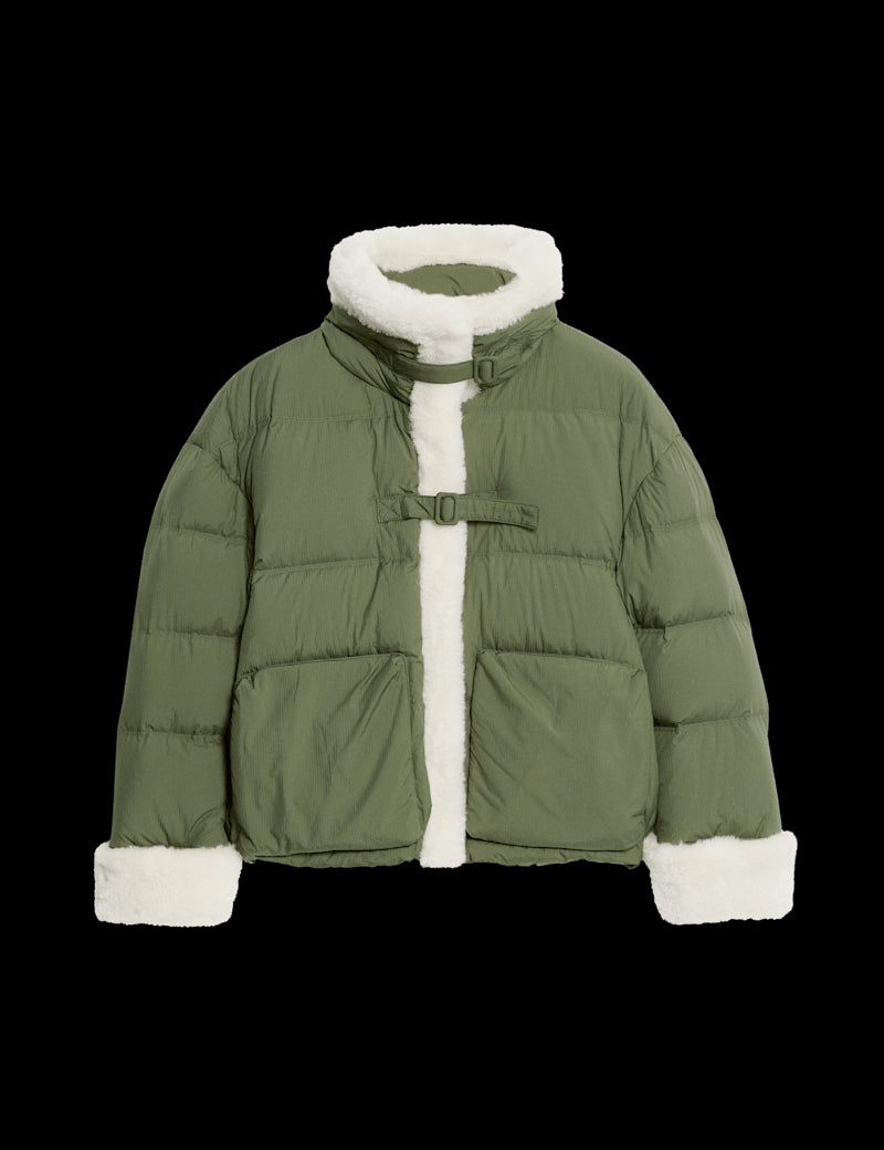 This padded jacket is filled with feather and down for lightweight warmth. It's designed in a regular fit with a cosy borg-lined funnel neck. The Stormwear™ piece is complete with two neck buckle fastenings, an internal zipped pocket and an innovative finish to protect from light rain showers.