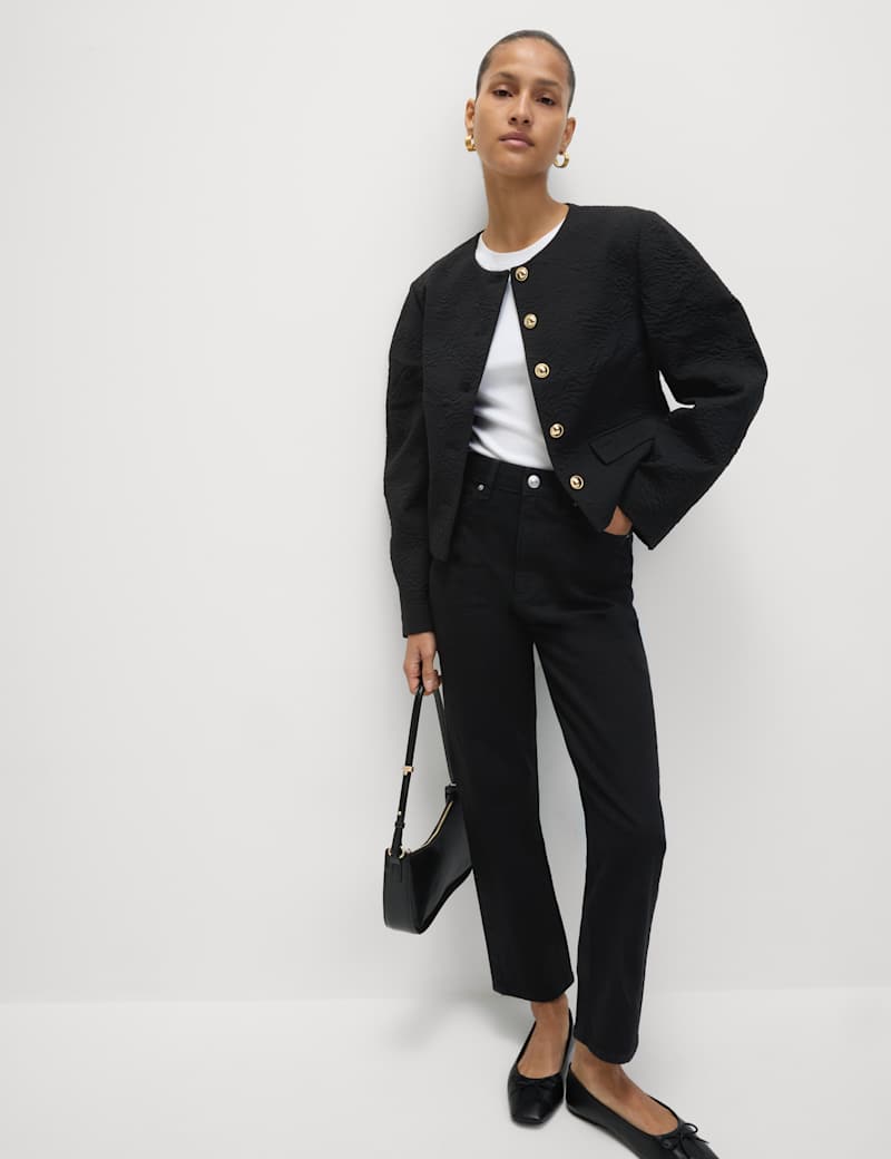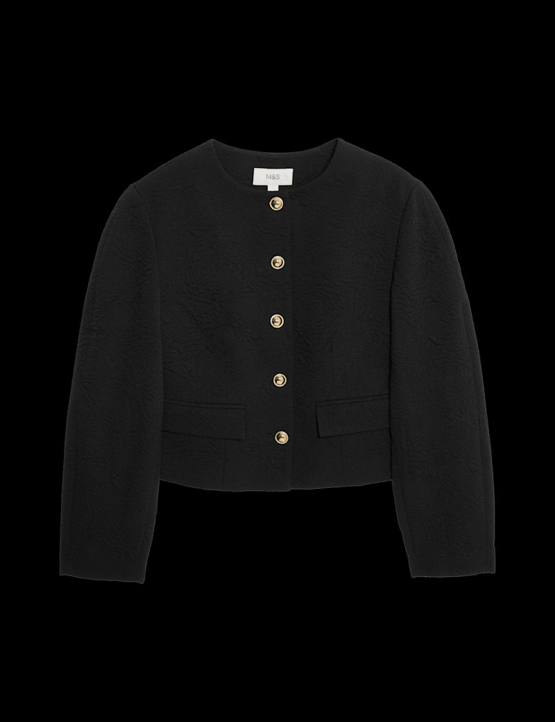 This jacquard jacket is a smart and stylish choice. It's cut in a regular fit, with a sleek collarless design and statement gold button fastenings. The all-over rose pattern adds a feminine flourish, while two welt pockets provide a practical finishing touch.