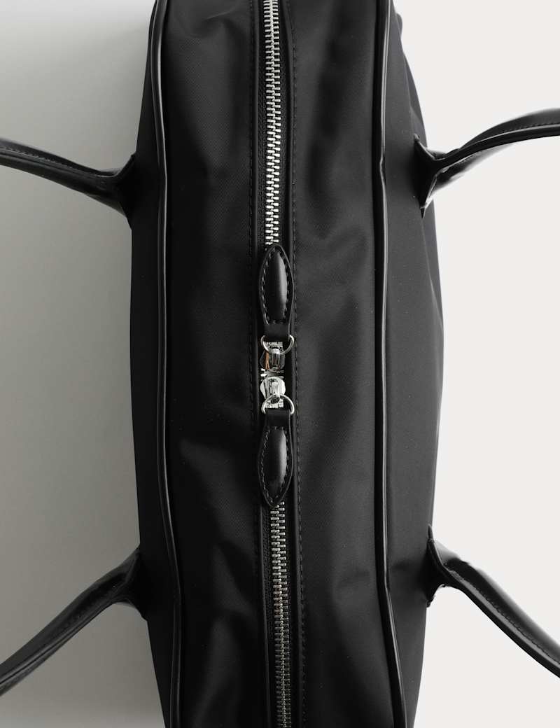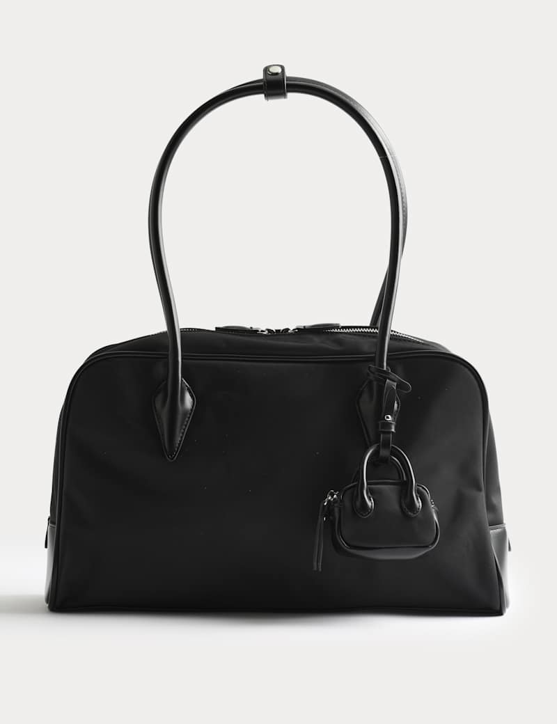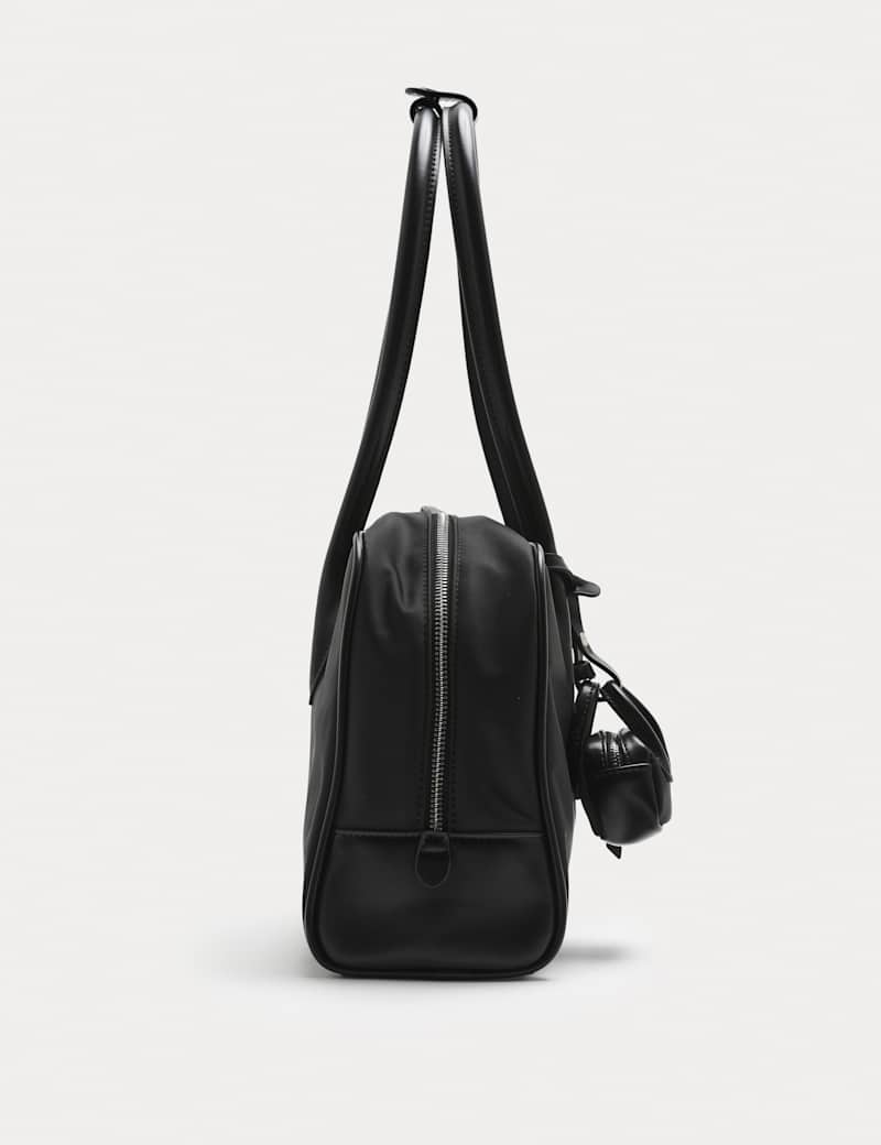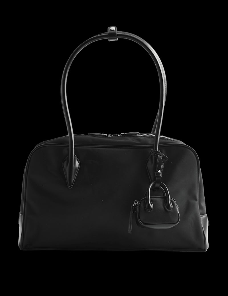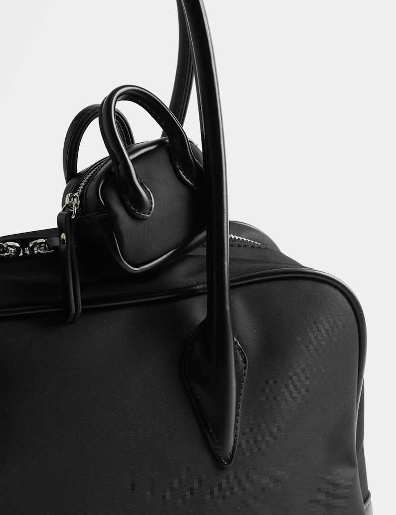 This bowler bag is made from durable nylon with faux leather trims for a sophisticated look. It features two top handles and a practical double zip closure. Fully lined. The tiny bag charm attached to the handle is perfect for storing loose change.