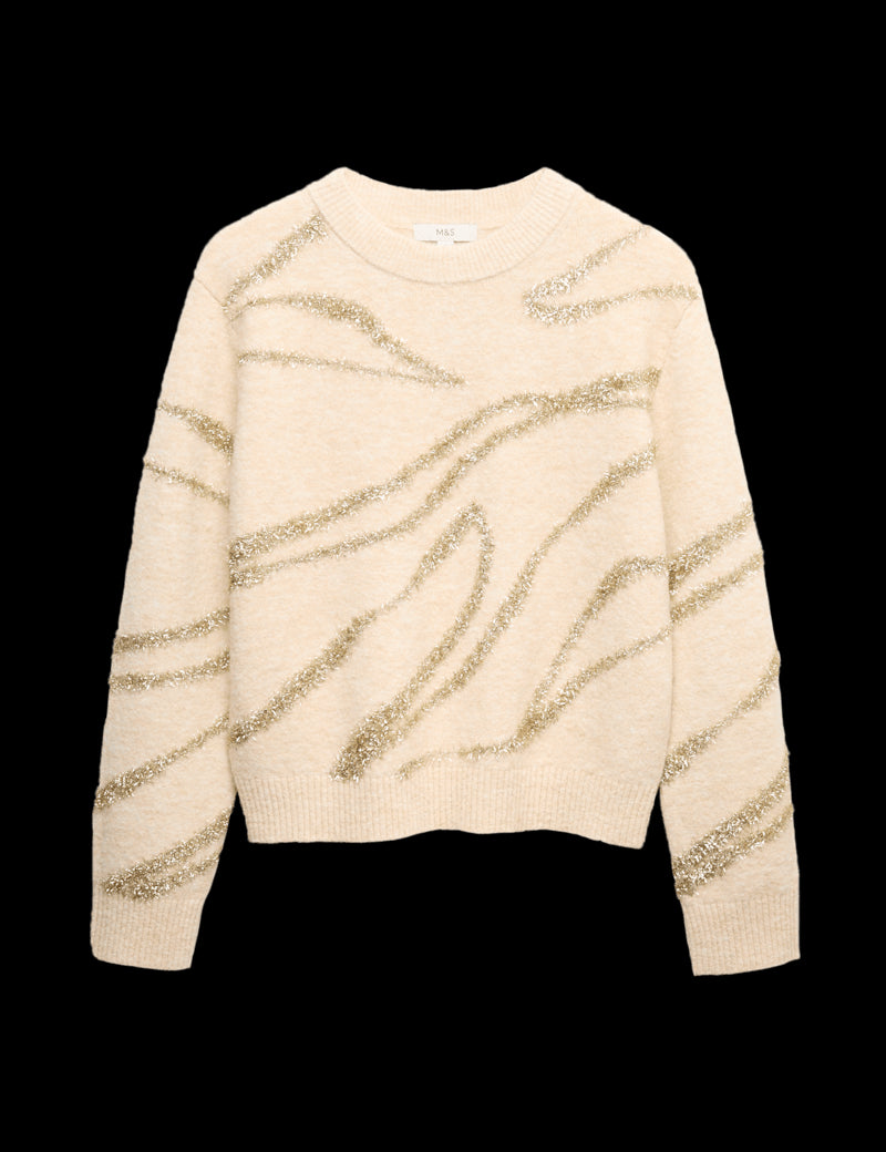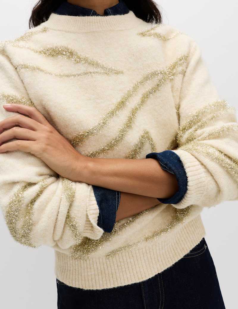 Add a touch of sparkle to your outfit with this jumper, featuring a textured tinsel animal print. It's designed in a relaxed fit, with added stretch for comfort. A ribbed trim on the crew neck, cuffs and hem adds subtle structure, while a dash of wool in the knit brings extra cosiness.
