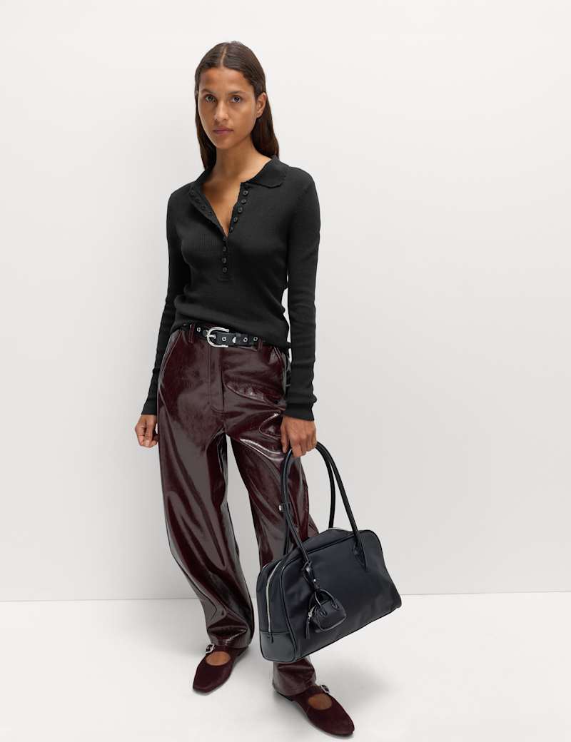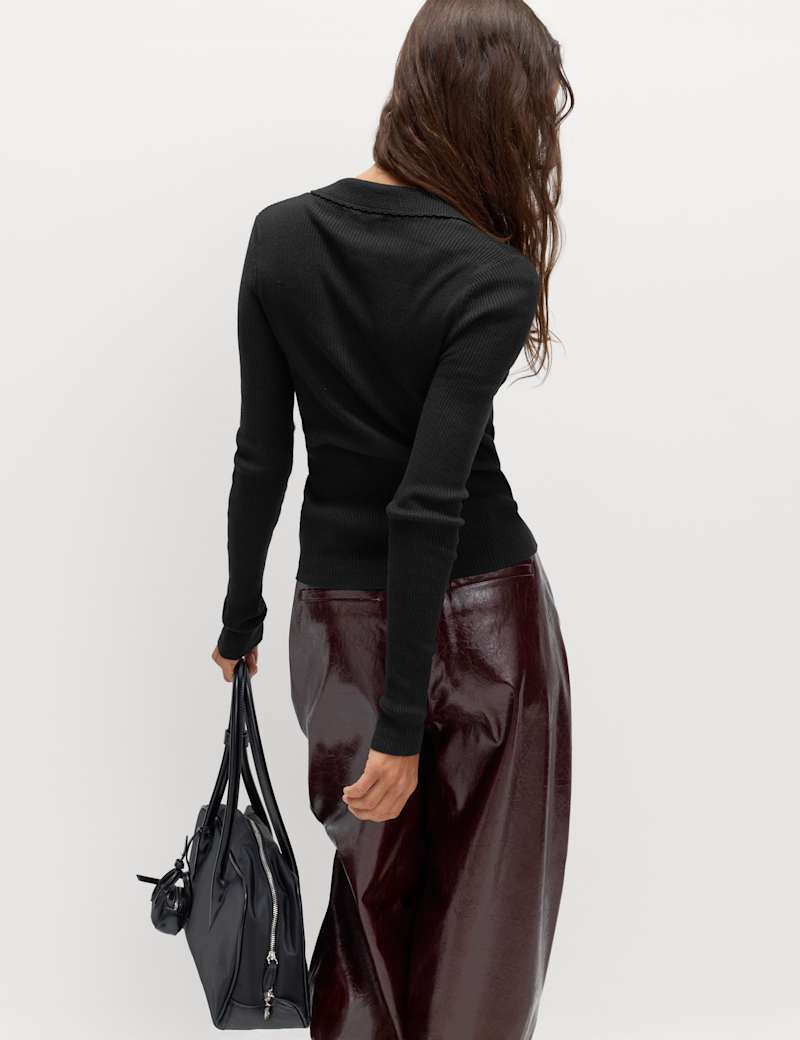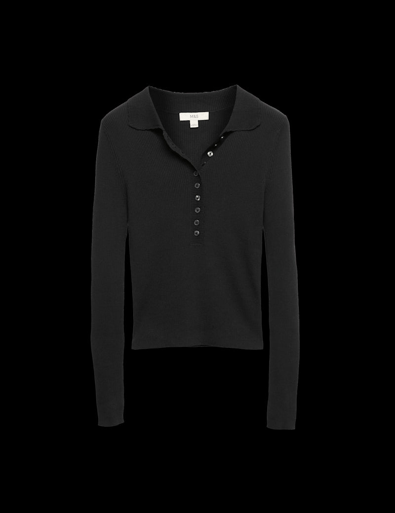 This ribbed knitted top will prove a hero of your separates wardrobe. The slim-fit design features long sleeves and a contrast-textured collar edged with feminine scalloped detailing. A half-placket punctuated with small lustrous buttons can be styled to suit you.