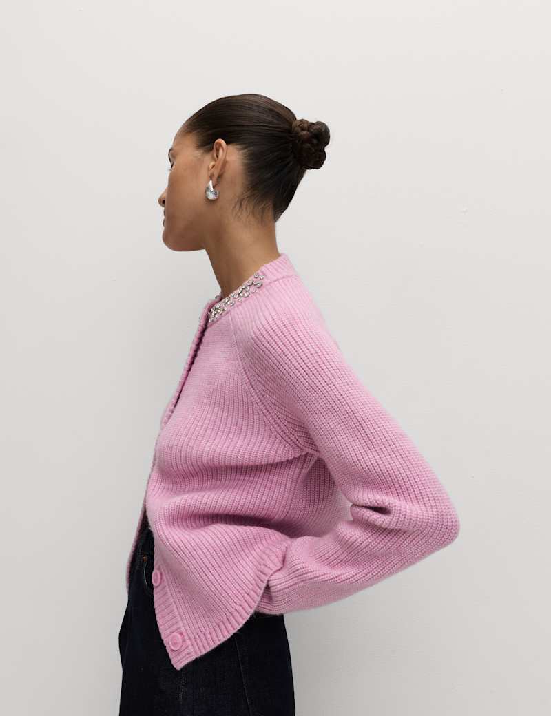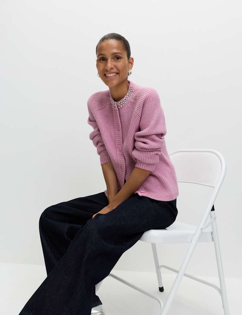 This textured cardigan is a glamorous addition to your wardrobe. It's designed in a regular fit, with a smart button-through front and a timeless crew neckline adorned with glinting embellishments for a touch of sparkle. Ribbed trims complete this cosy piece.
