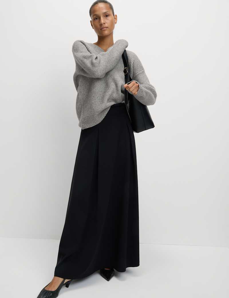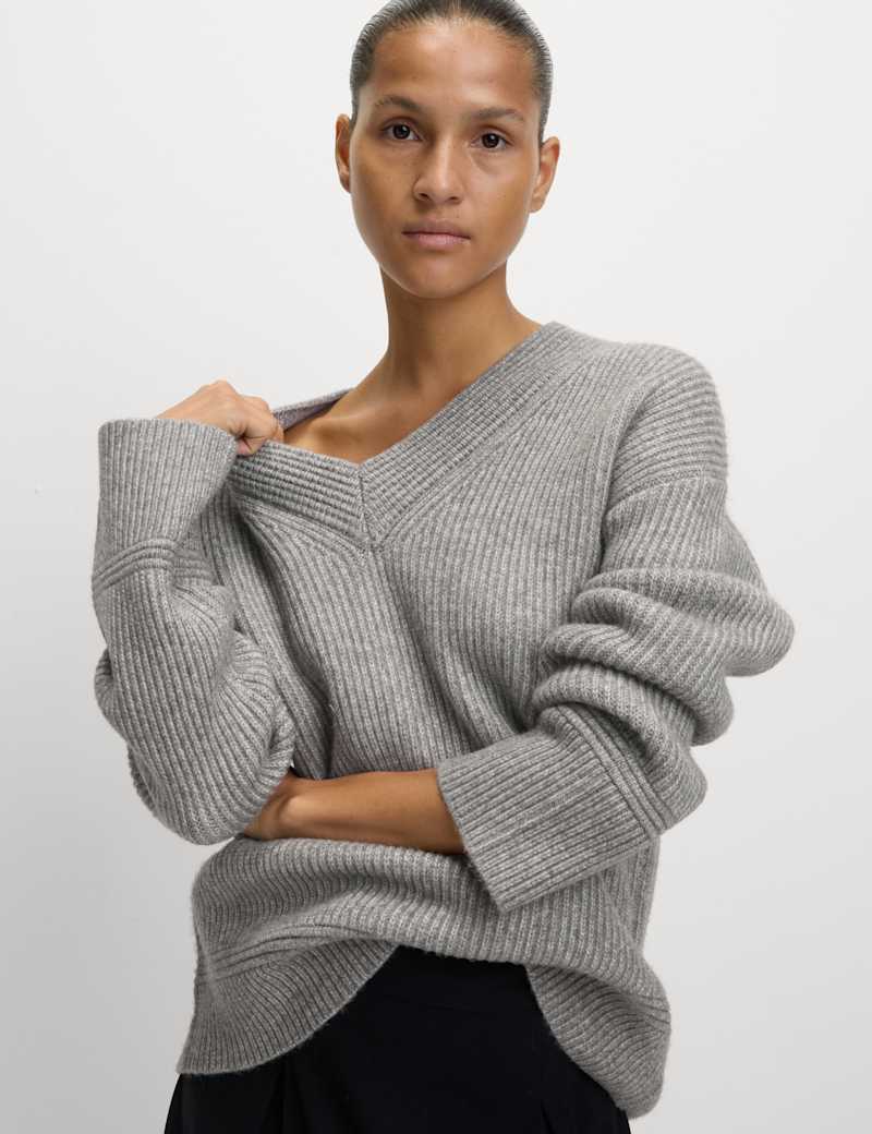 Layer up in luxurious comfort with this jumper knitted from our ultra-fine cloud-yarn, spun for amazing softness. It's designed in a regular fit, with dropped shoulders for a laidback aesthetic. The feminine v-neckline features a waffle texture to contrast with the ribbed body. Horizontal lines at the cuffs and hem create a further play of texture.
