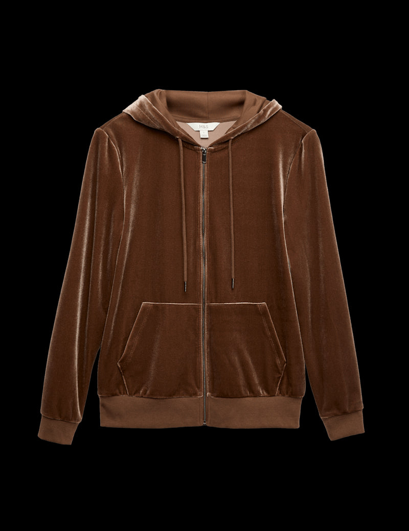 This zip-through hoodie is crafted from soft velour for a touch of luxury during off-duty days. Comfy regular fit, with added stretch for easy movement. Features a drawstring hood and two front pockets.