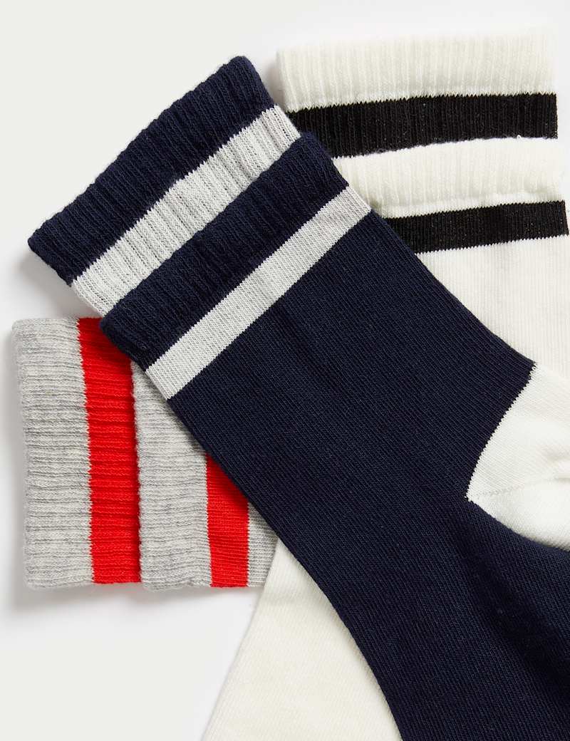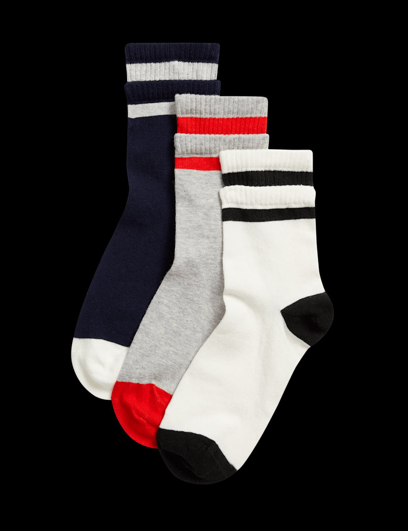A double stripe design on the cuff lends a sporty look to this three-pack of cotton-rich socks. Ankle-high styles with added stretch for extra comfort. Complete with contrasting toes and heels.