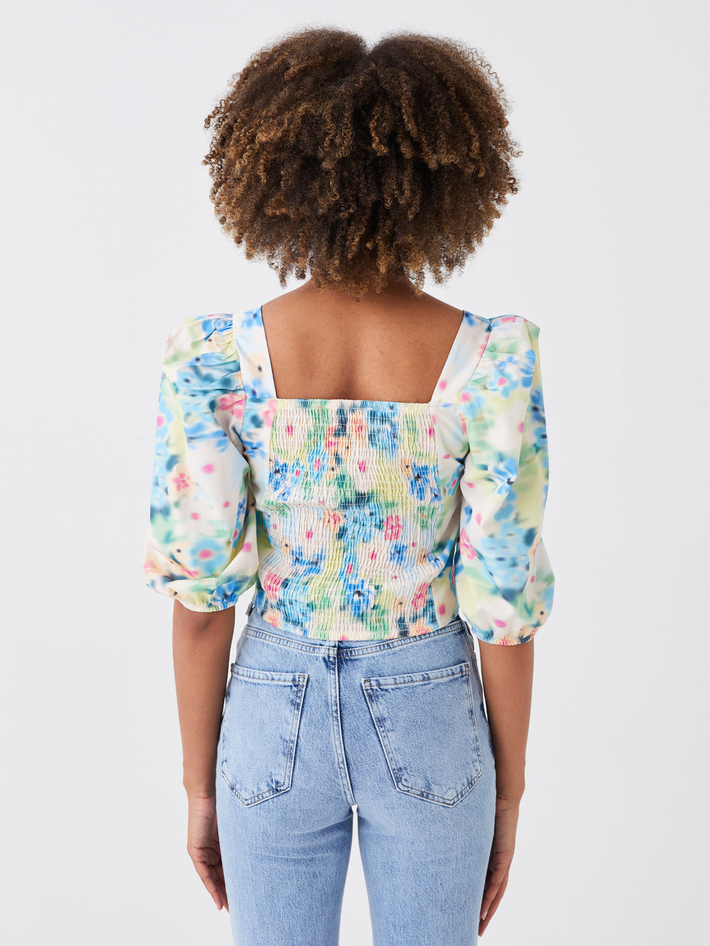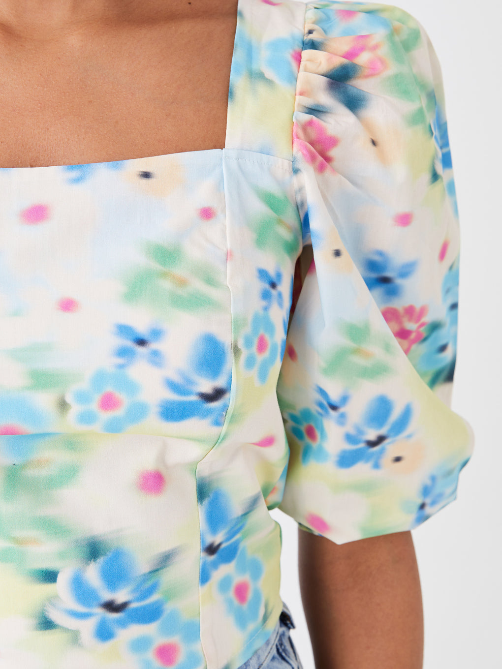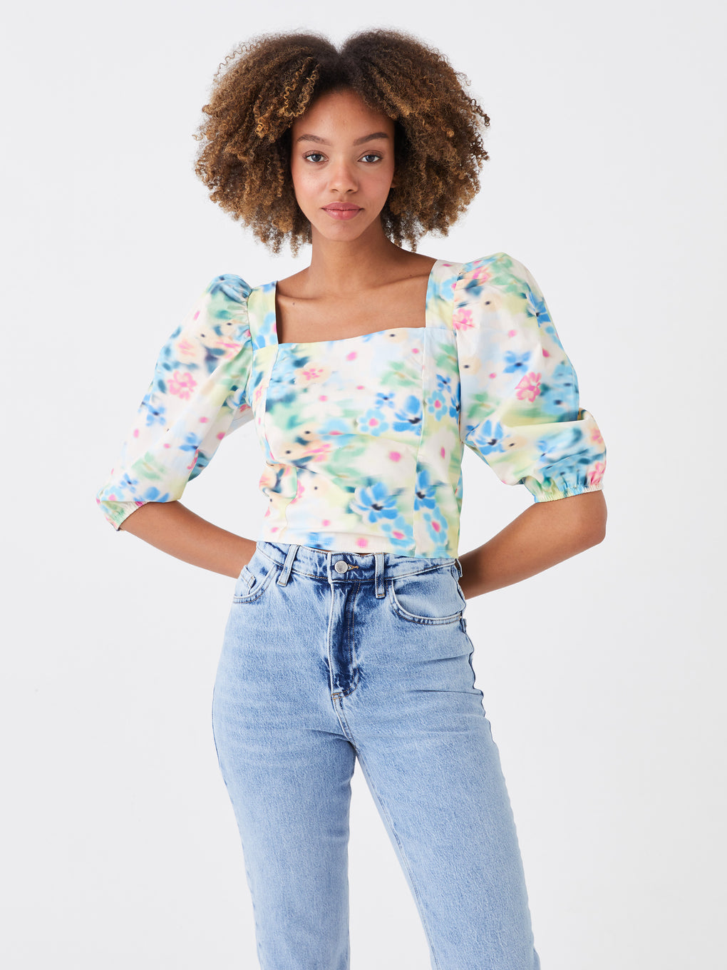 Square Neck Floral Balloon Sleeve Crop Women's Blouse